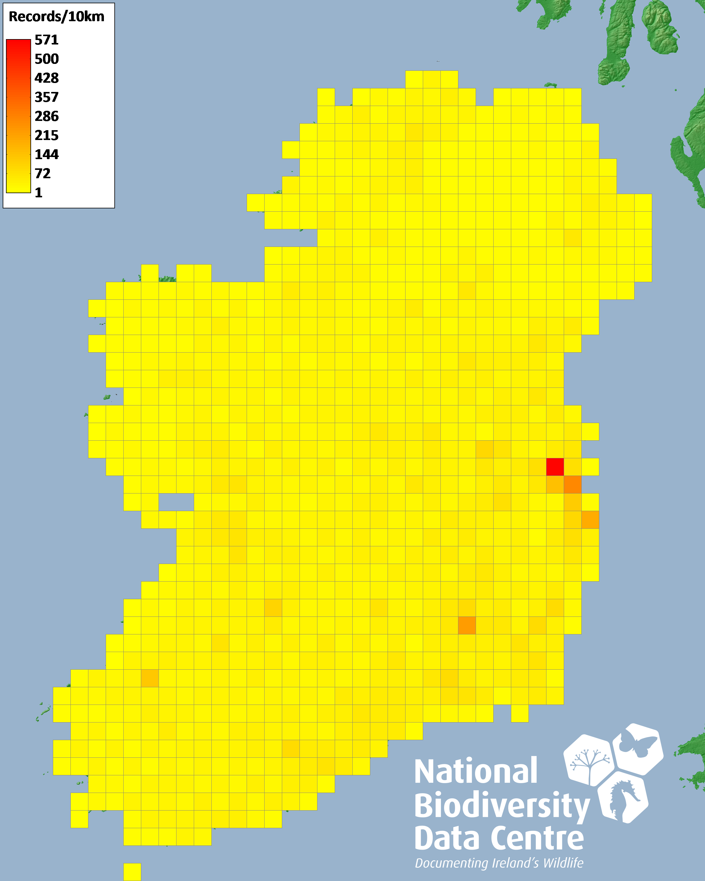 Distribution of the number of records recorded within each 10km grid square (ITM).Marine Map - 50km