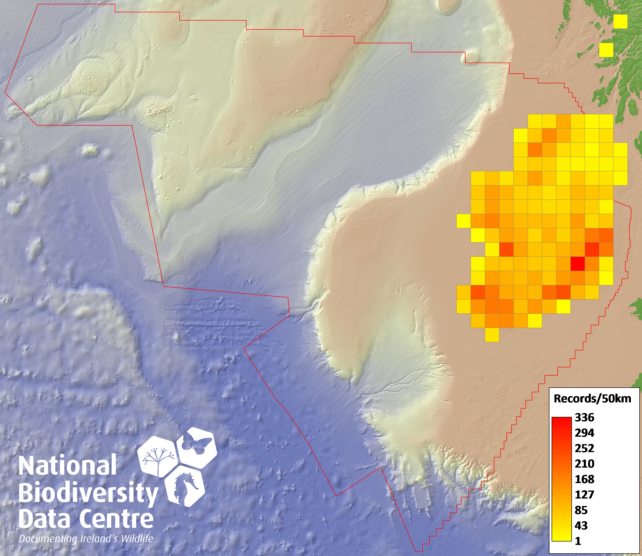 Distribution of the number of records recorded within each 10km grid square (ITM).Marine Map - 50km