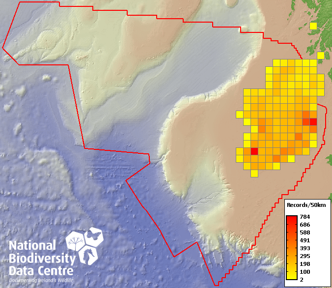 Distribution of the number of records recorded within each 10km grid square (ITM).Marine Map - 50km