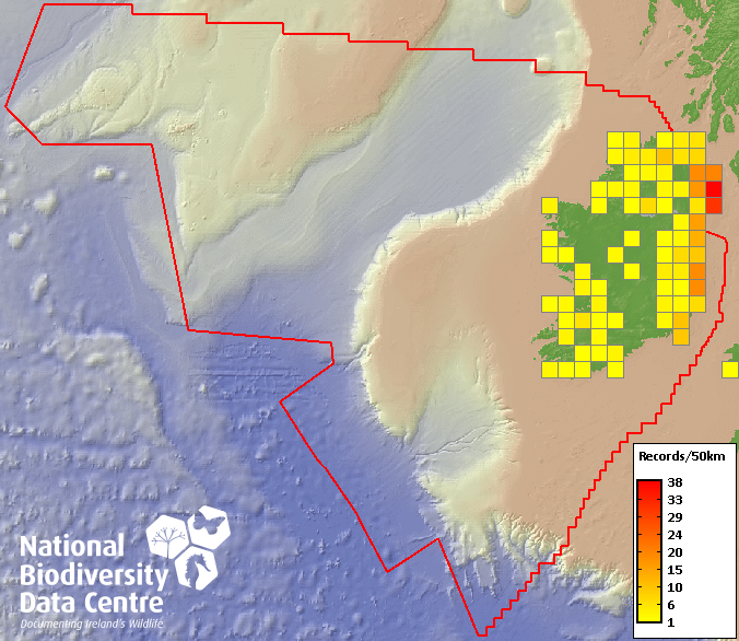 Distribution of the number of records recorded within each 10km grid square (ITM).Marine Map - 50km