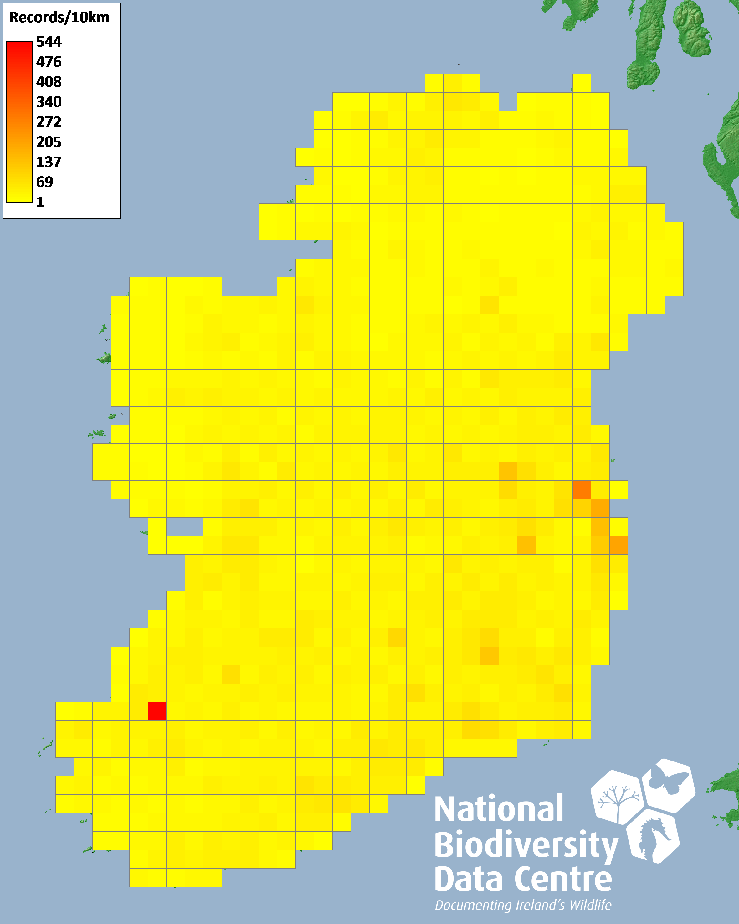 Distribution of the number of records recorded within each 10km grid square (ITM).Marine Map - 50km