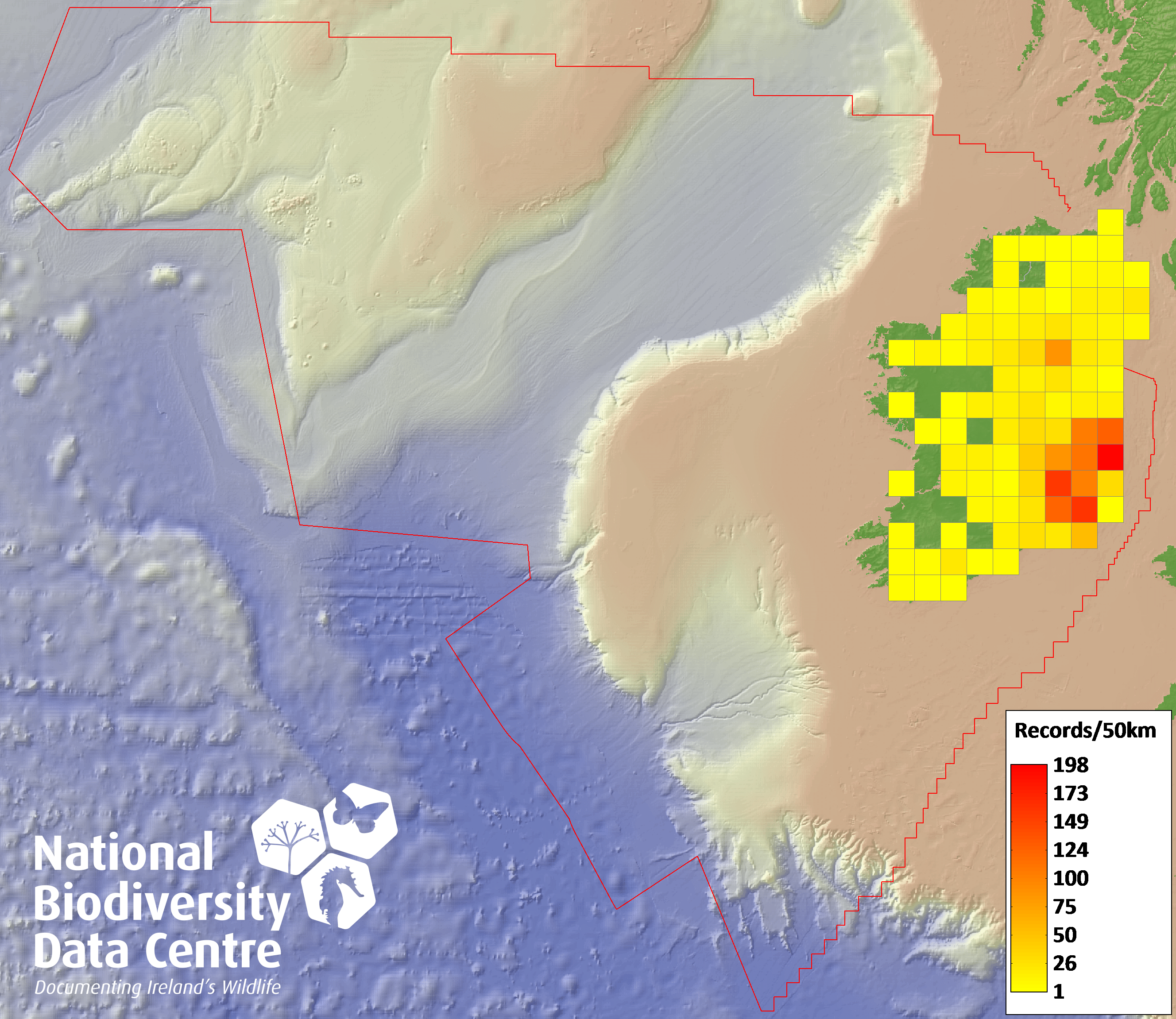 Distribution of the number of records recorded within each 10km grid square (ITM).Marine Map - 50km