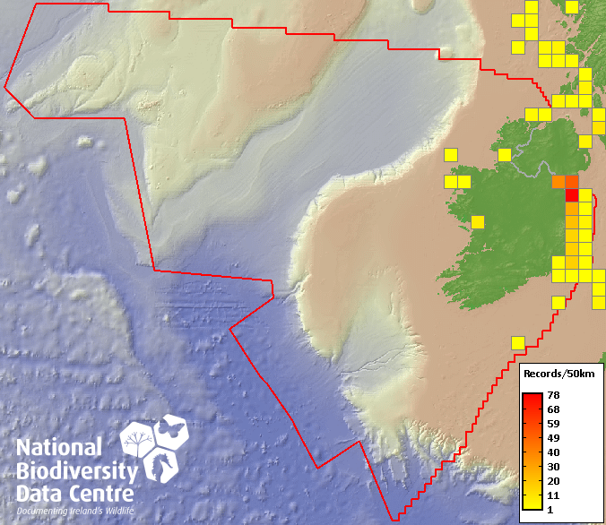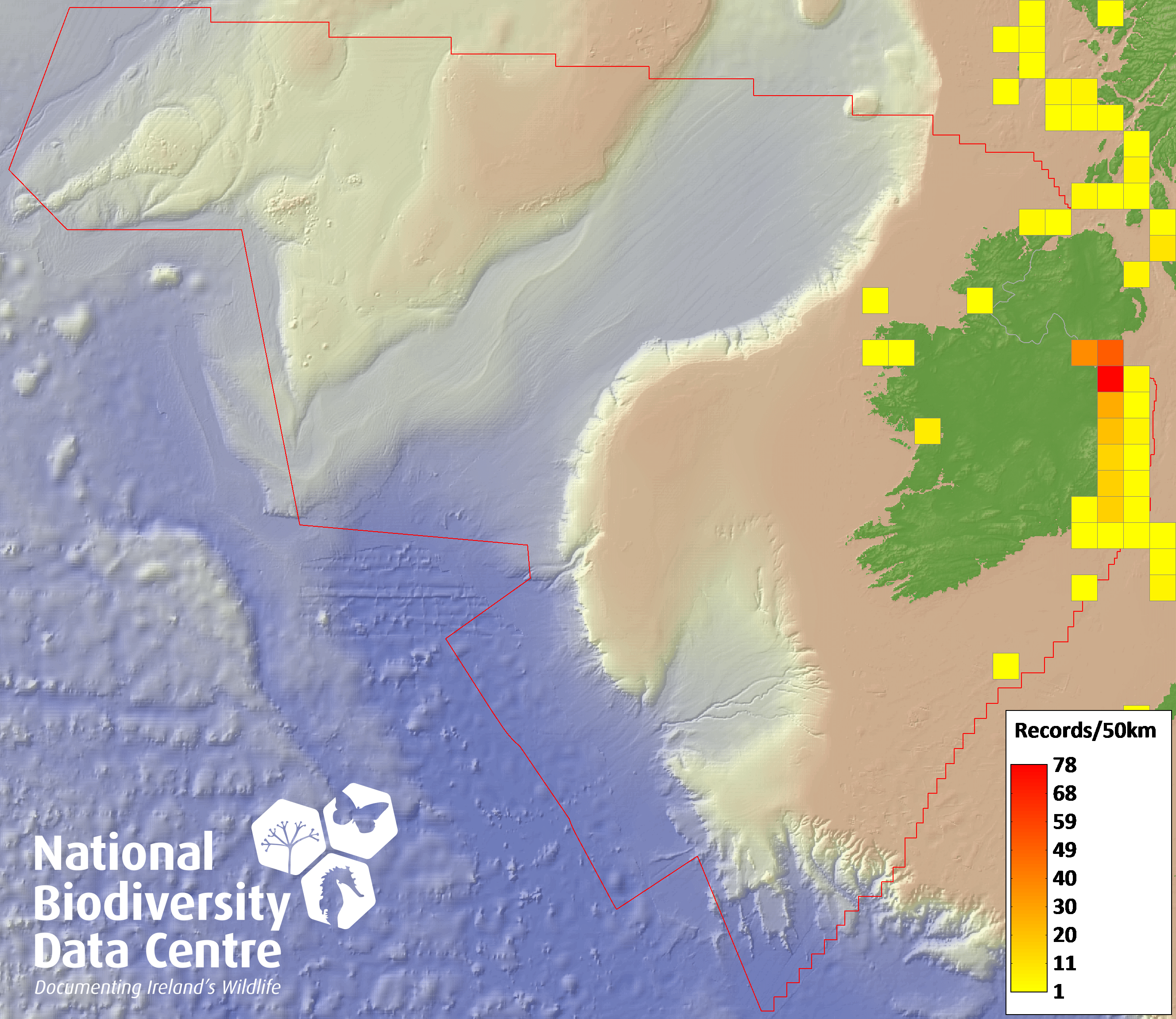Distribution of the number of records recorded within each 10km grid square (ITM).Marine Map - 50km