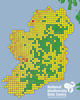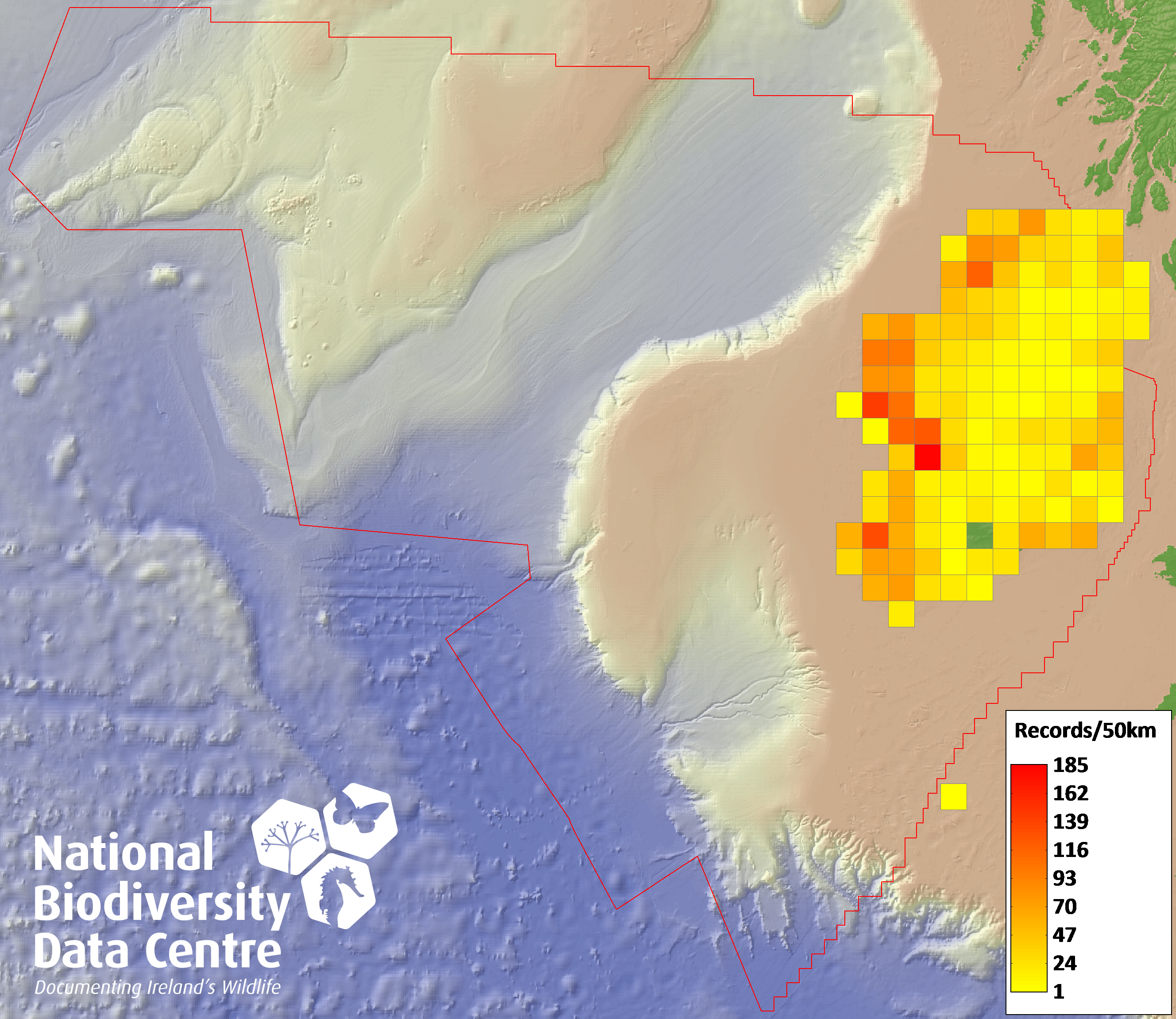 Distribution of the number of records recorded within each 10km grid square (ITM).Marine Map - 50km