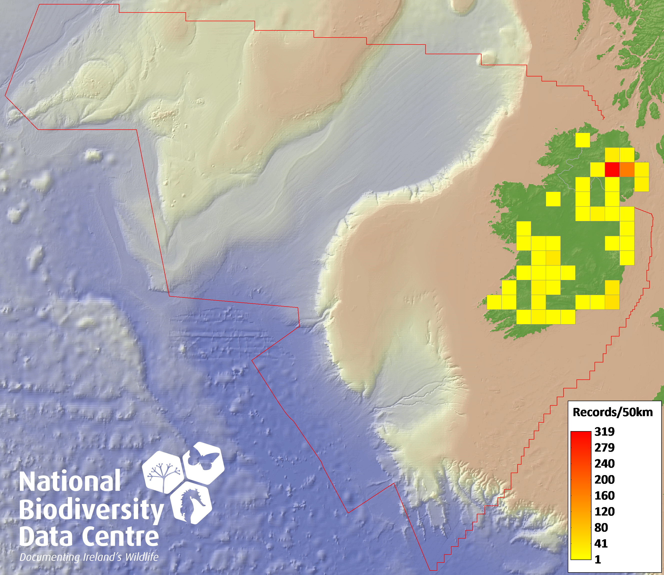 Distribution of the number of records recorded within each 10km grid square (ITM).Marine Map - 50km