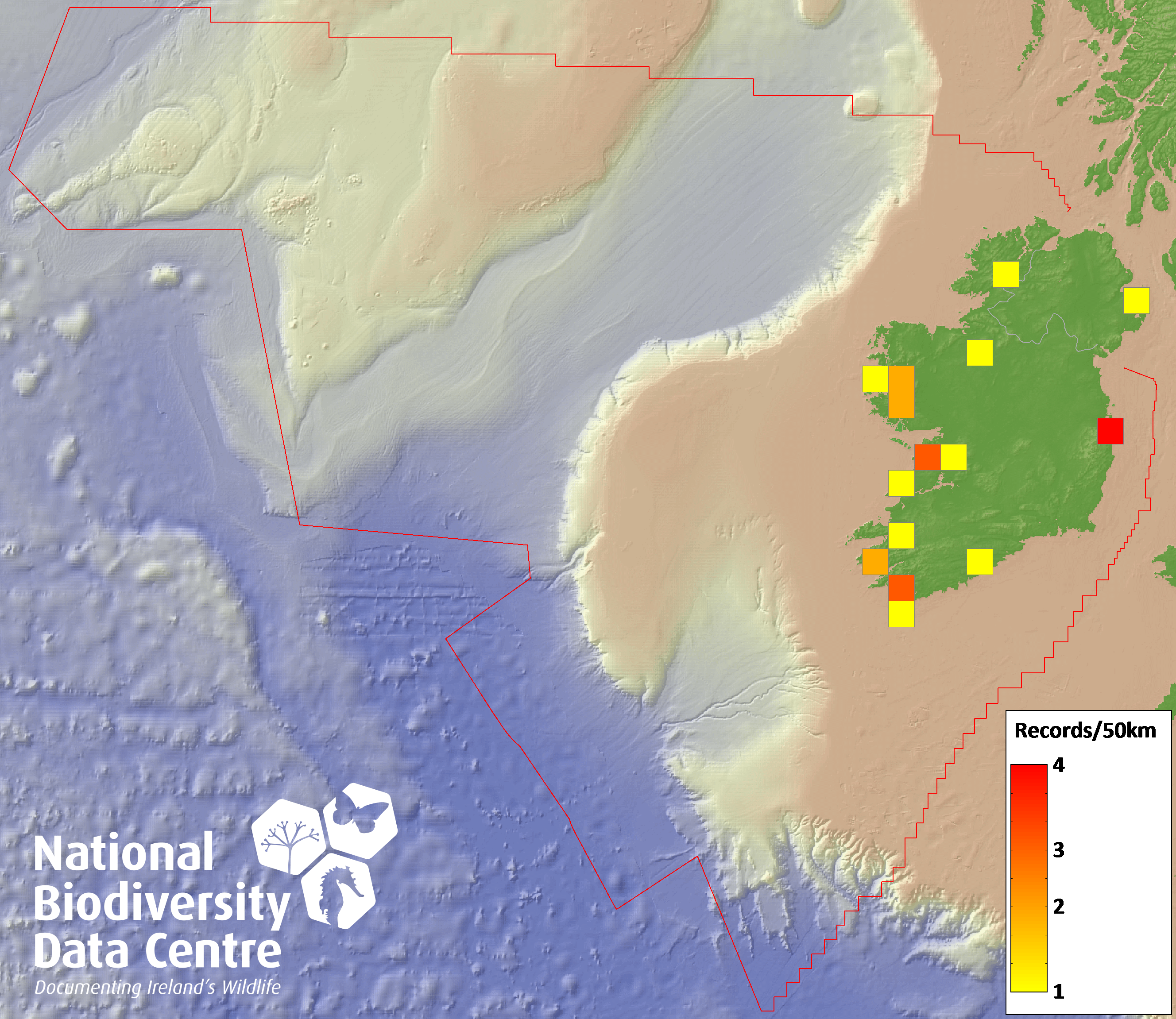 Distribution of the number of records recorded within each 10km grid square (ITM).Marine Map - 50km