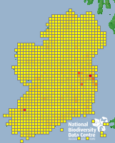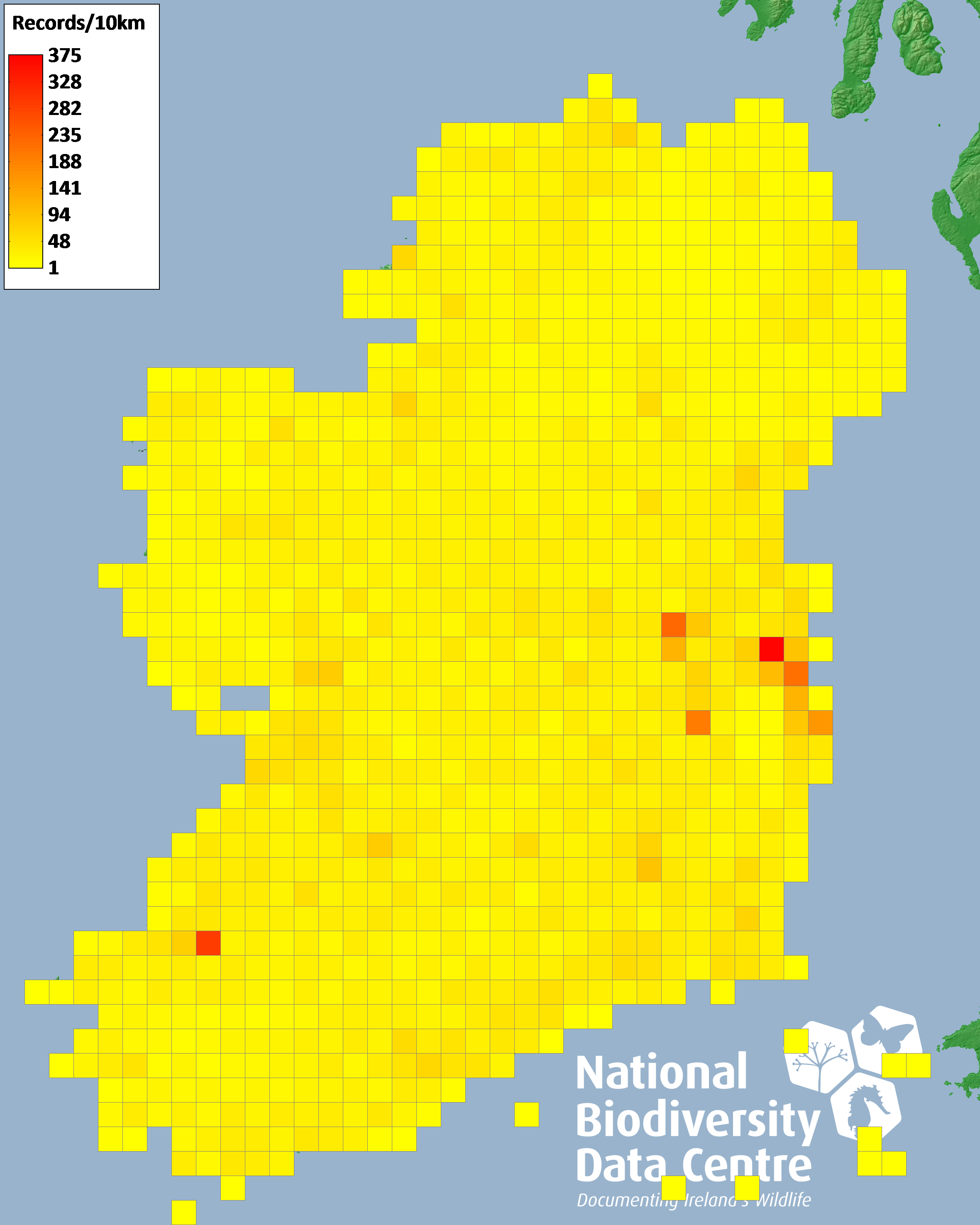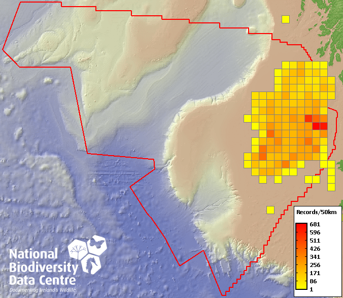 Distribution of the number of records recorded within each 10km grid square (ITM).Marine Map - 50km