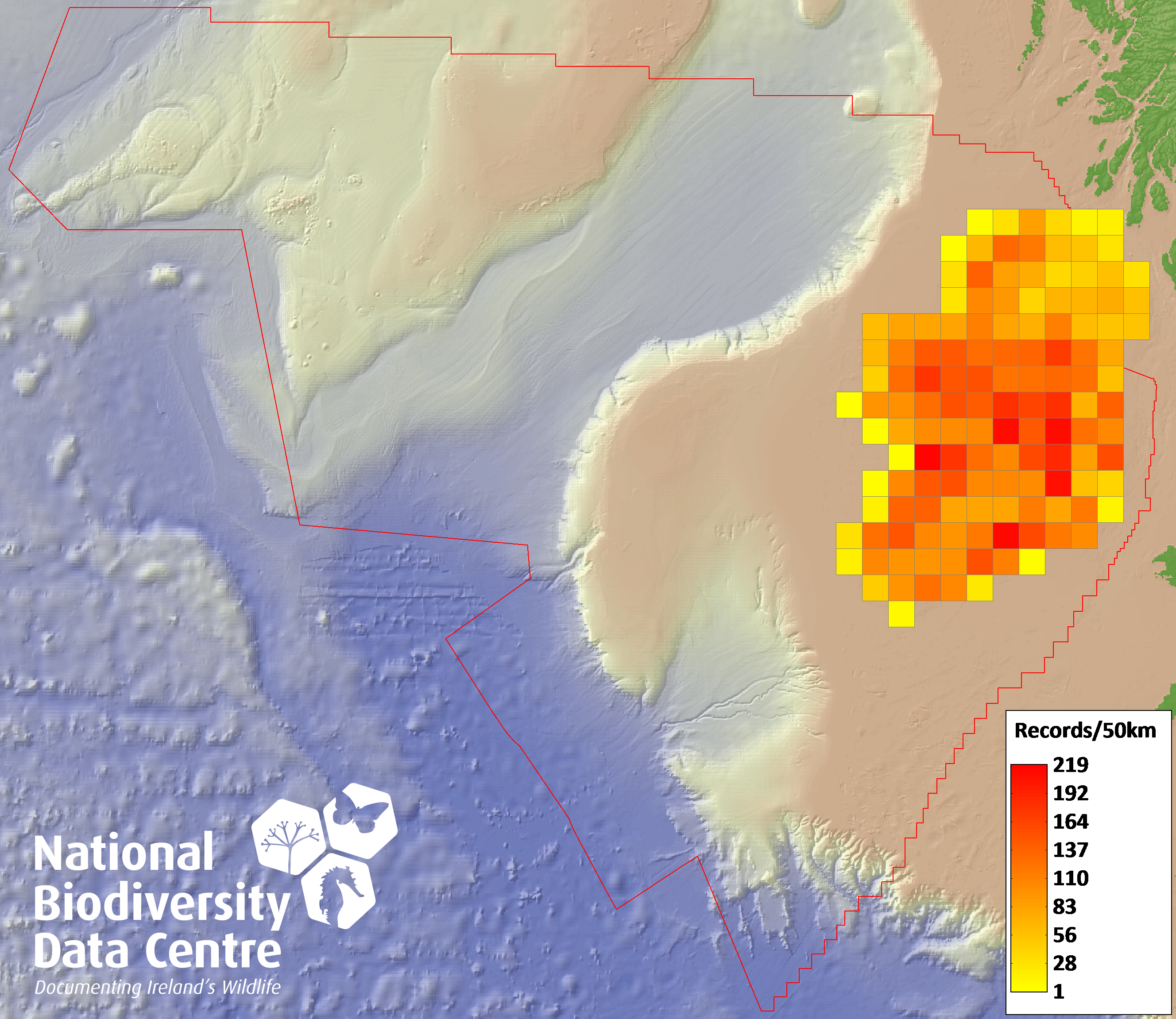 Distribution of the number of records recorded within each 10km grid square (ITM).Marine Map - 50km