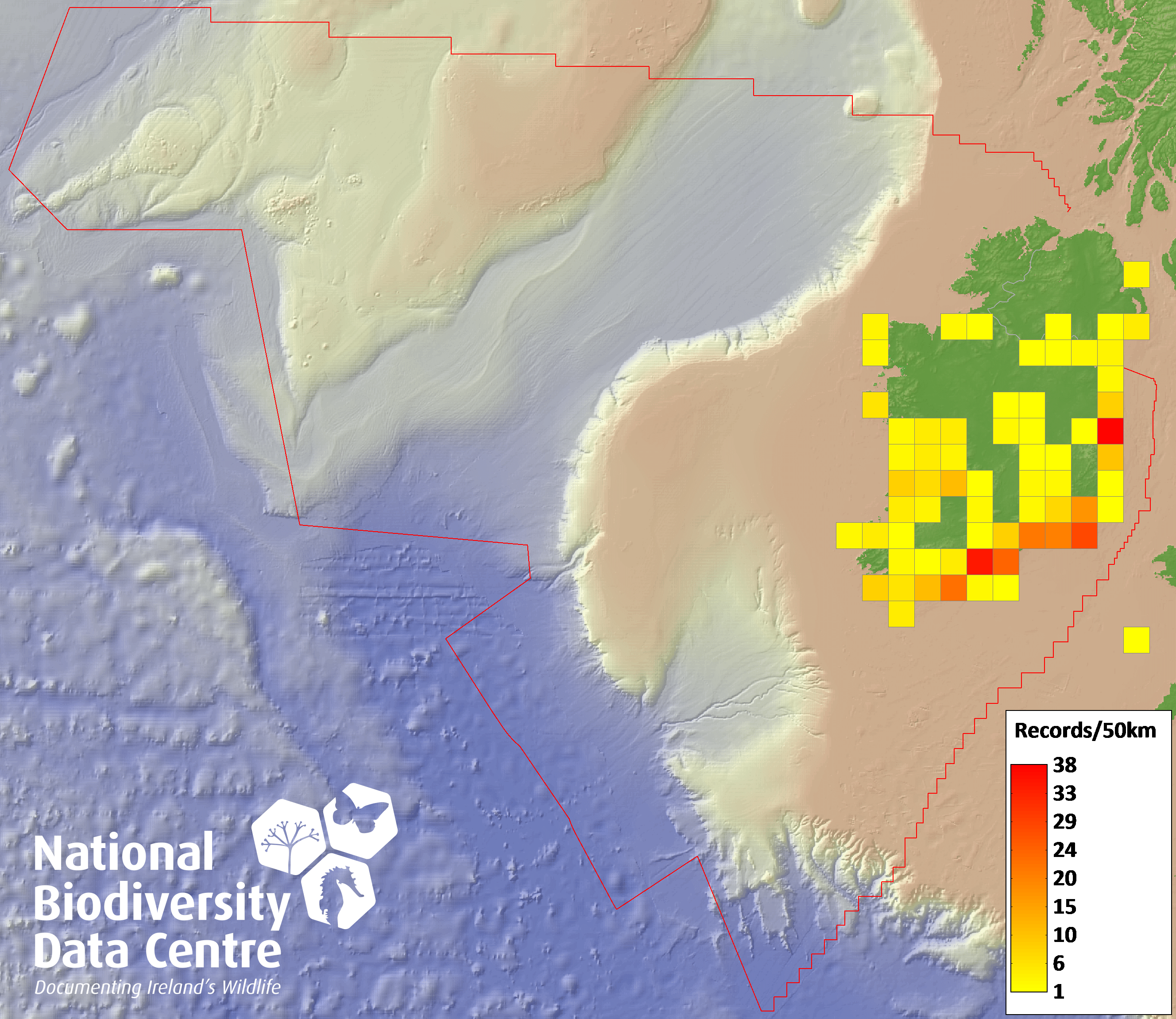Distribution of the number of records recorded within each 10km grid square (ITM).Marine Map - 50km