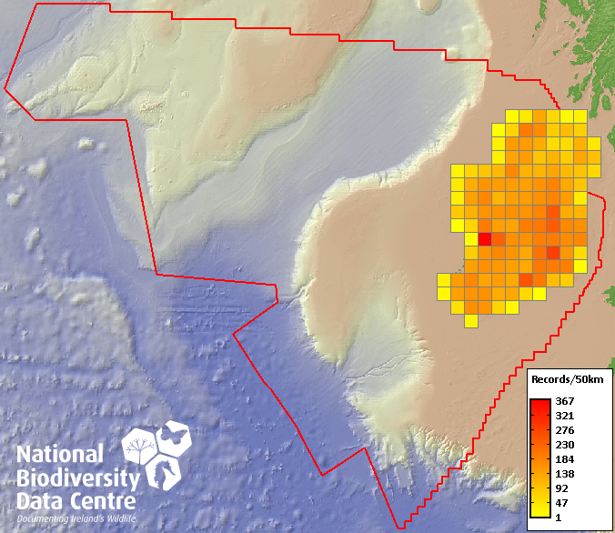 Distribution of the number of records recorded within each 10km grid square (ITM).Marine Map - 50km