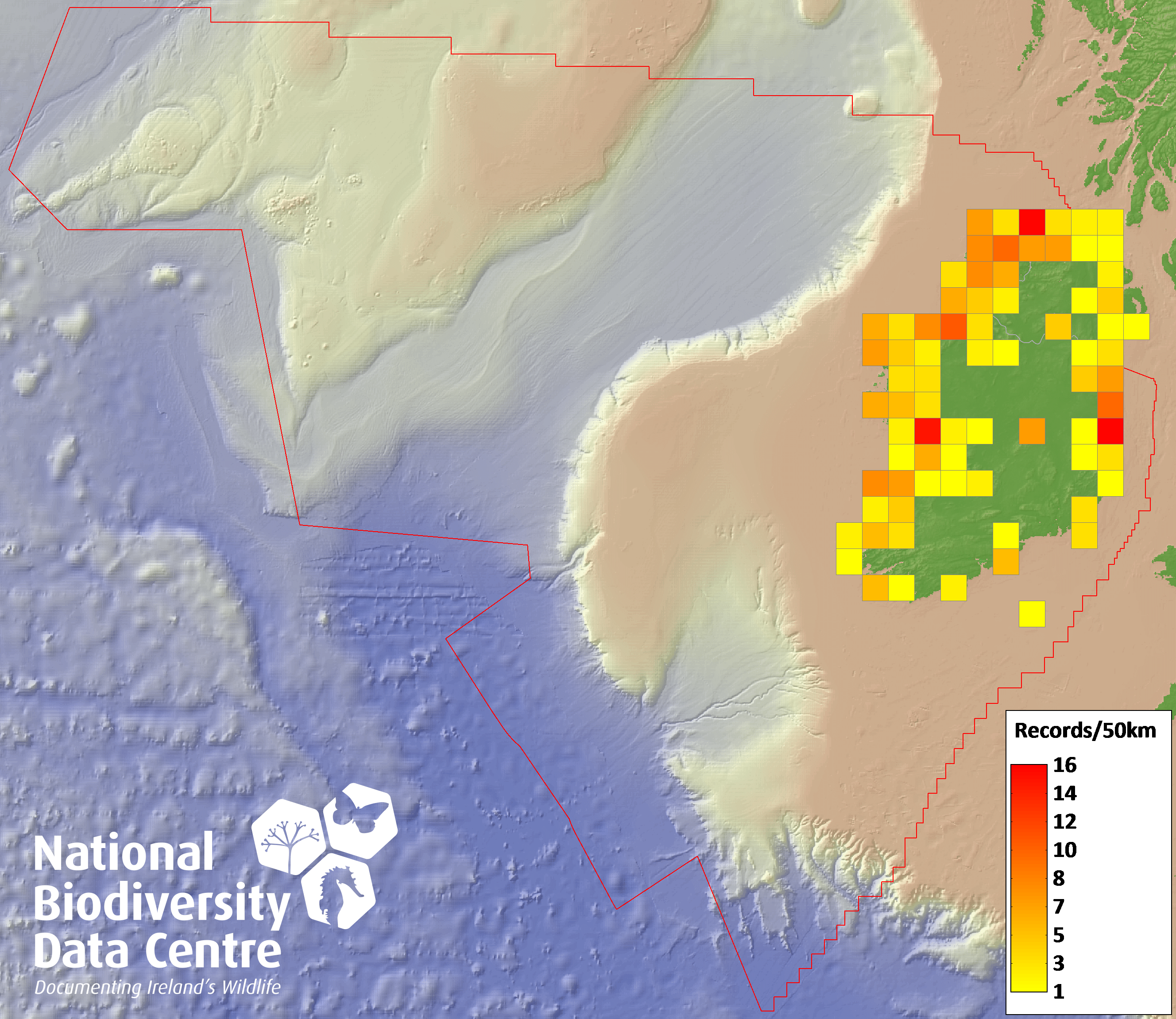 Distribution of the number of records recorded within each 10km grid square (ITM).Marine Map - 50km