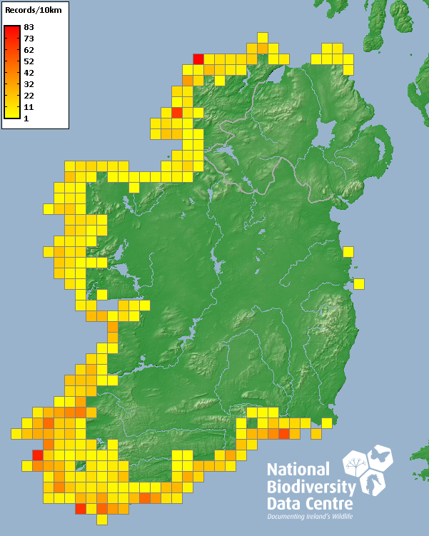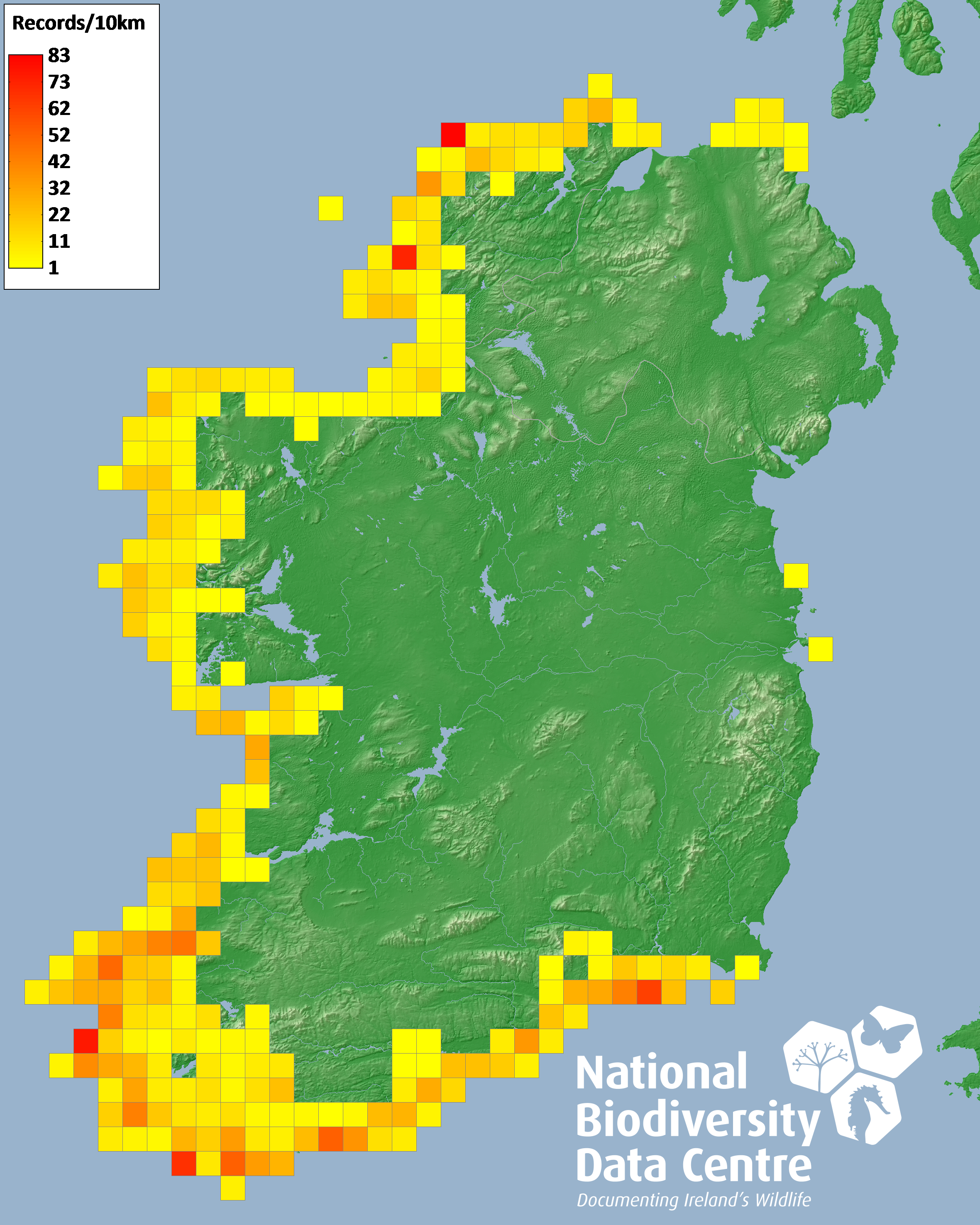 Distribution of the number of records recorded within each 10km grid square (ITM).Marine Map - 50km