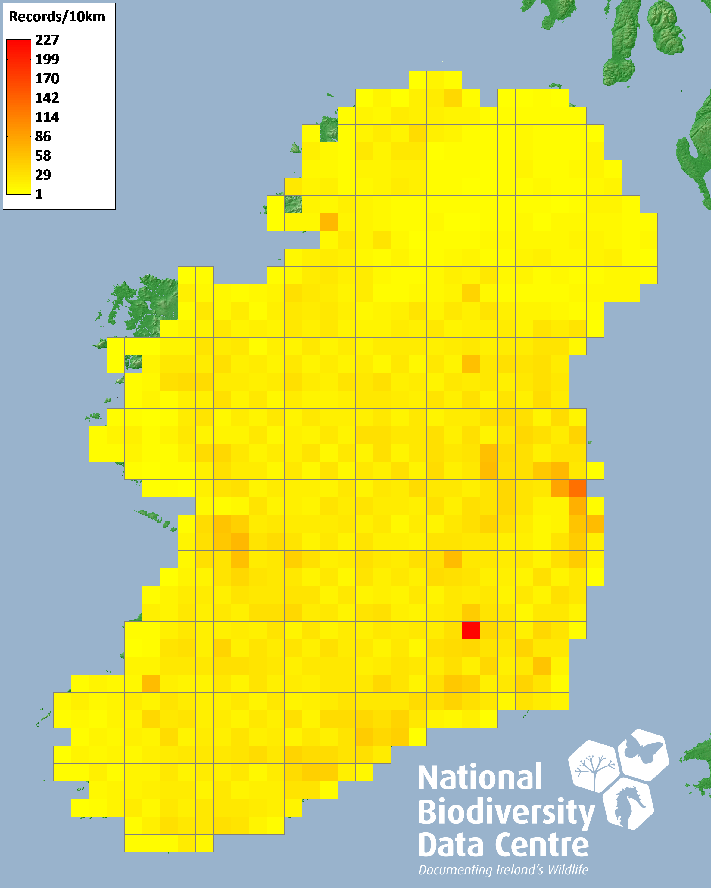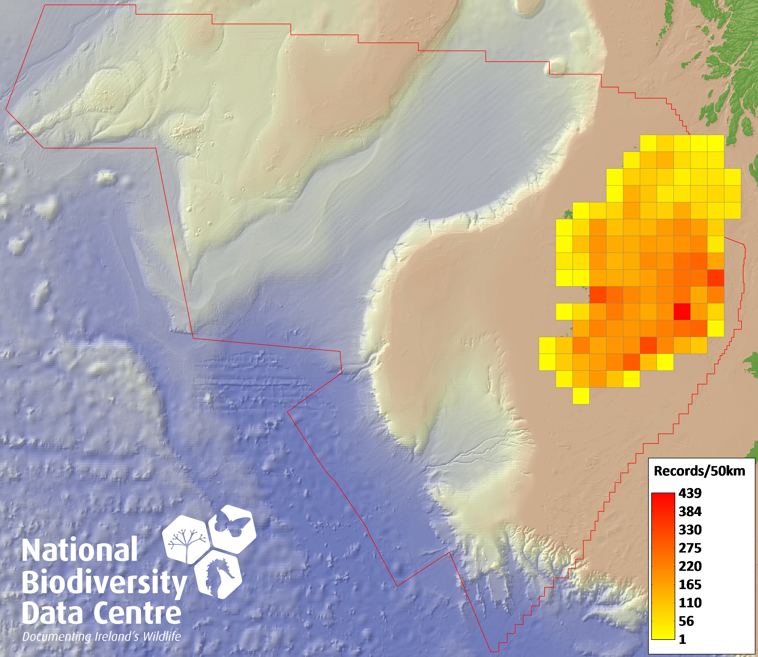 Distribution of the number of records recorded within each 10km grid square (ITM).Marine Map - 50km