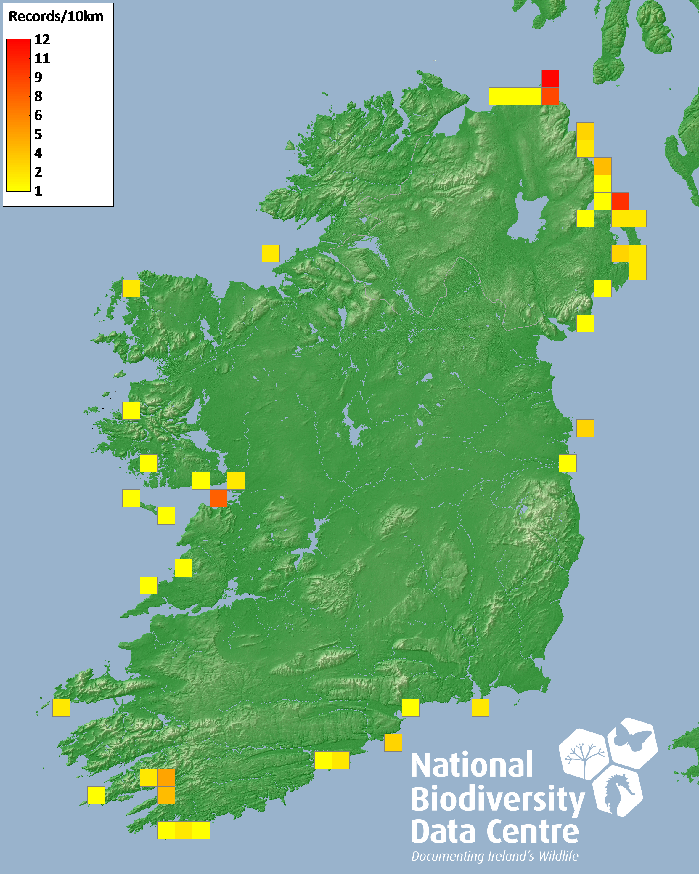 Distribution of the number of records recorded within each 10km grid square (ITM).Marine Map - 50km