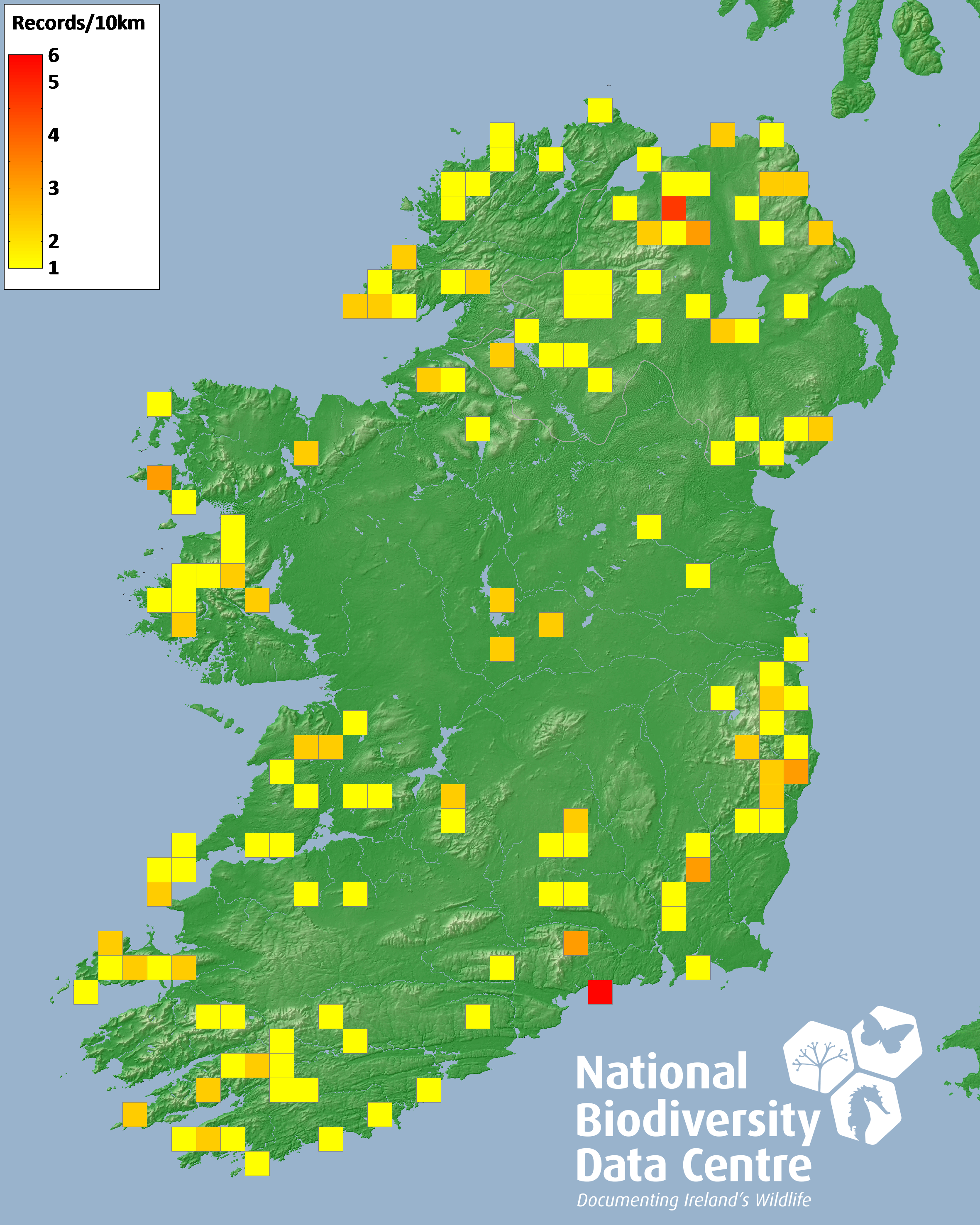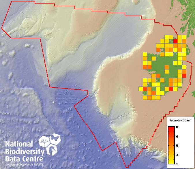 Distribution of the number of records recorded within each 10km grid square (ITM).Marine Map - 50km