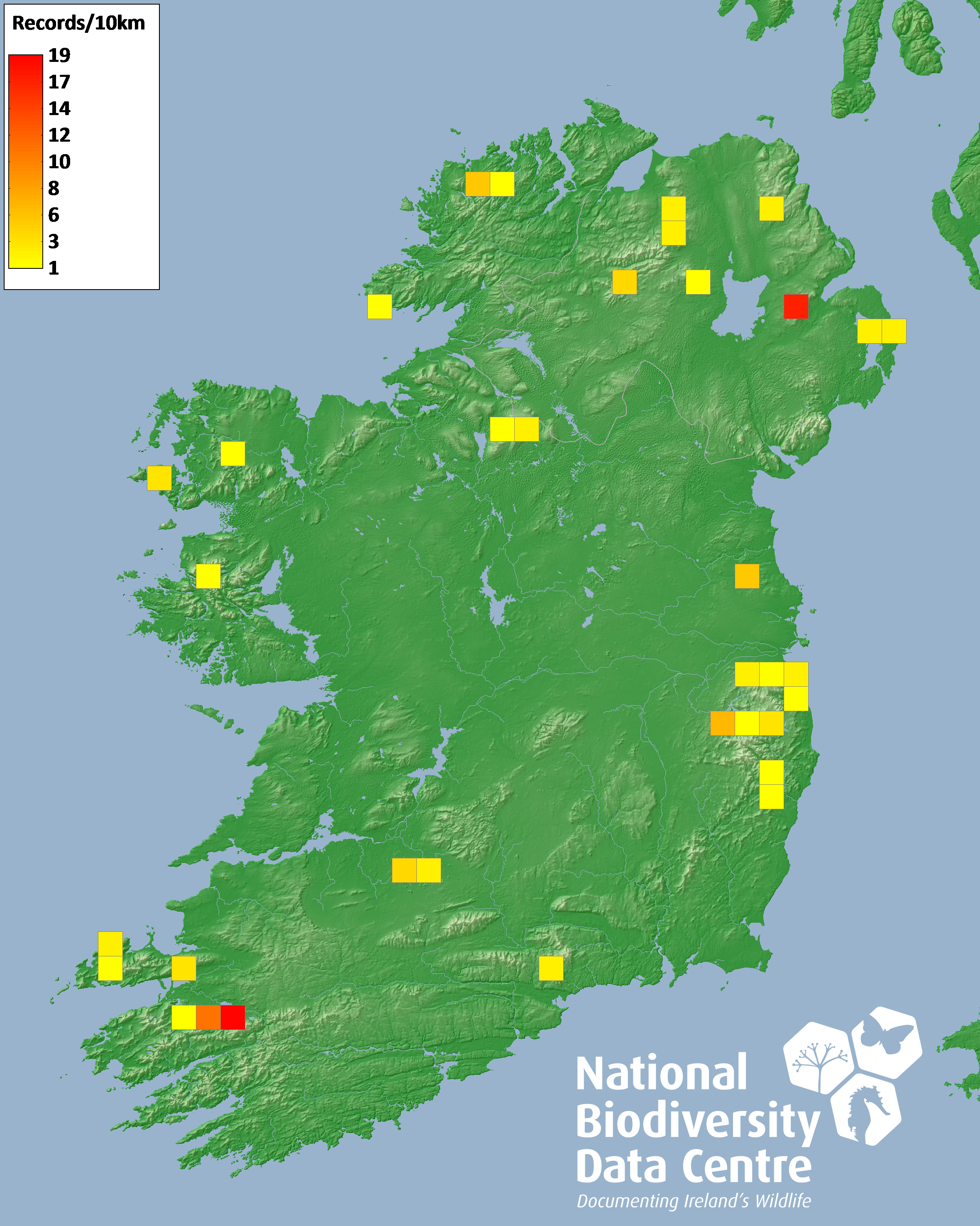 Distribution of the number of records recorded within each 10km grid square (ITM).Marine Map - 50km