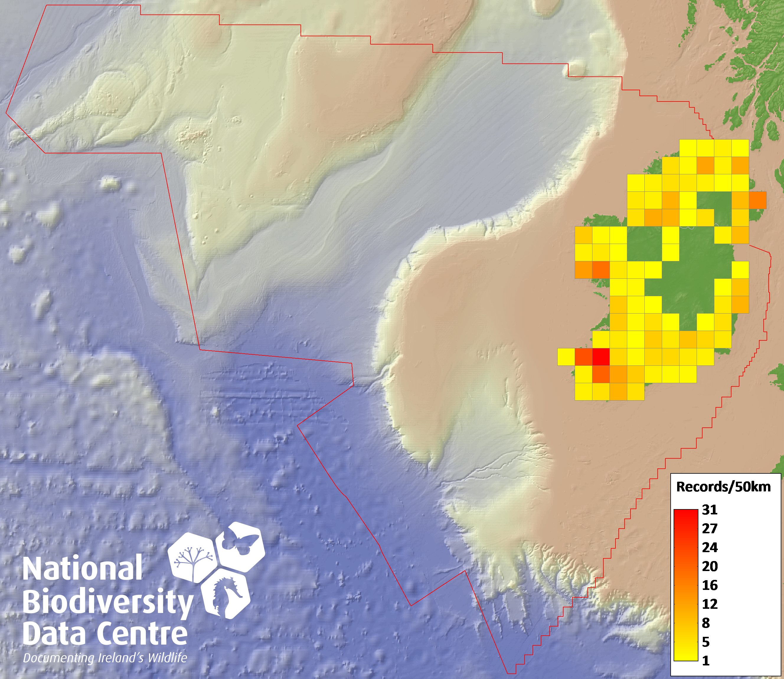 Distribution of the number of records recorded within each 10km grid square (ITM).Marine Map - 50km