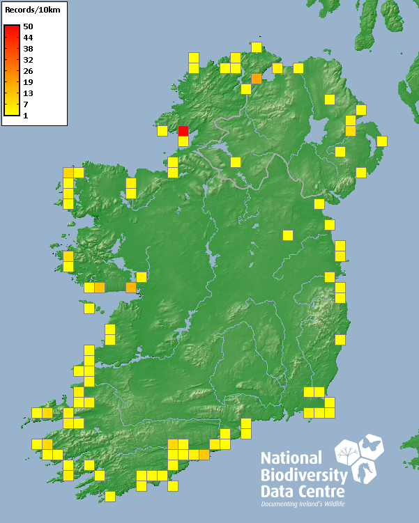 Distribution of the number of records recorded within each 10km grid square (ITM).Marine Map - 50km