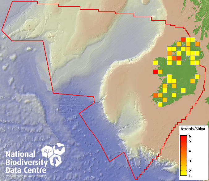 Distribution of the number of records recorded within each 10km grid square (ITM).Marine Map - 50km