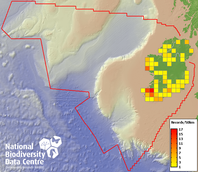 Distribution of the number of records recorded within each 10km grid square (ITM).Marine Map - 50km