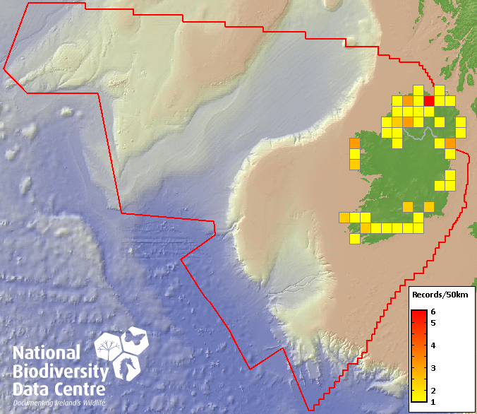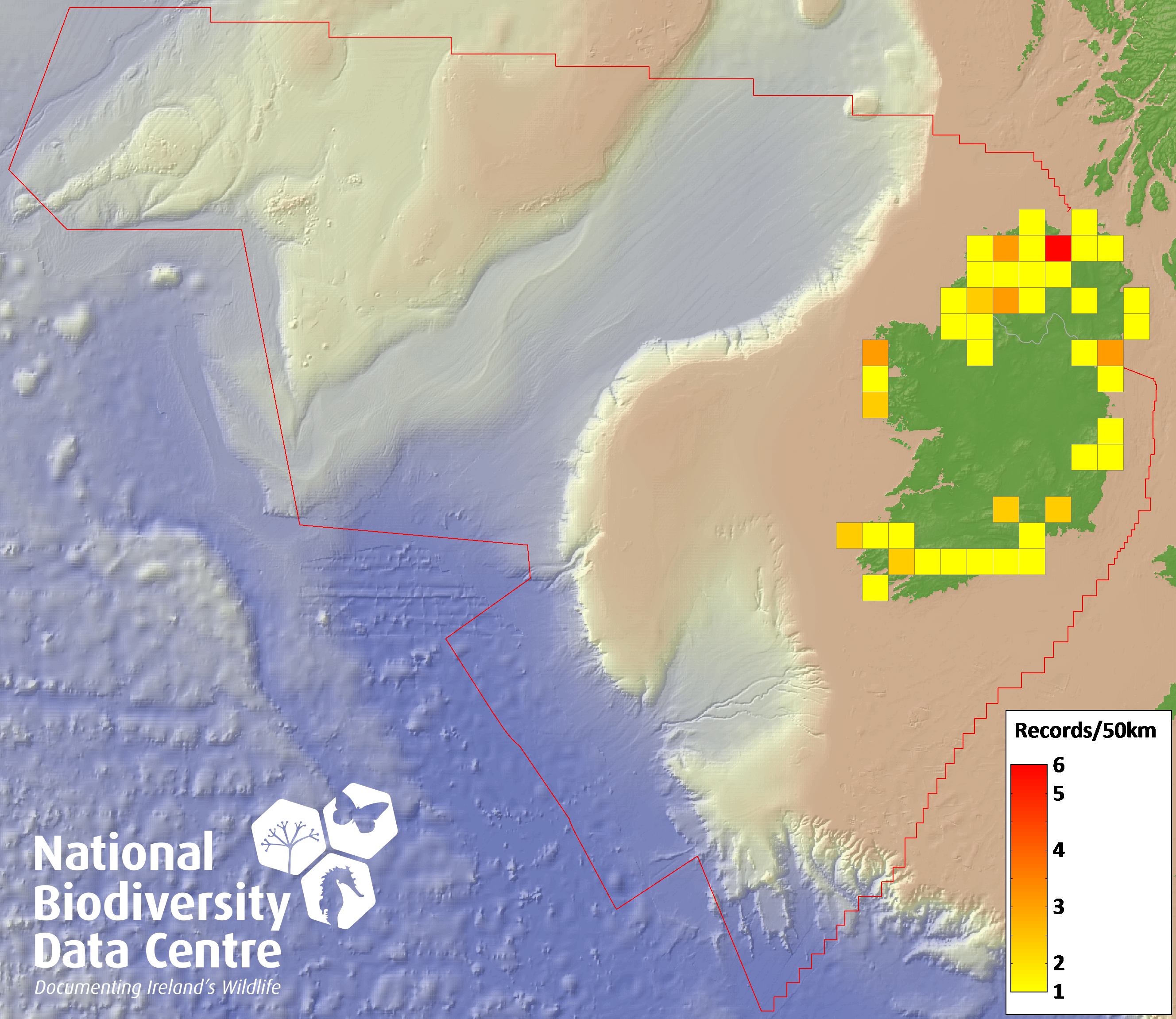 Distribution of the number of records recorded within each 10km grid square (ITM).Marine Map - 50km