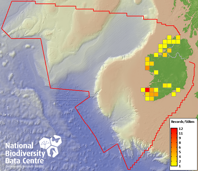 Distribution of the number of records recorded within each 10km grid square (ITM).Marine Map - 50km