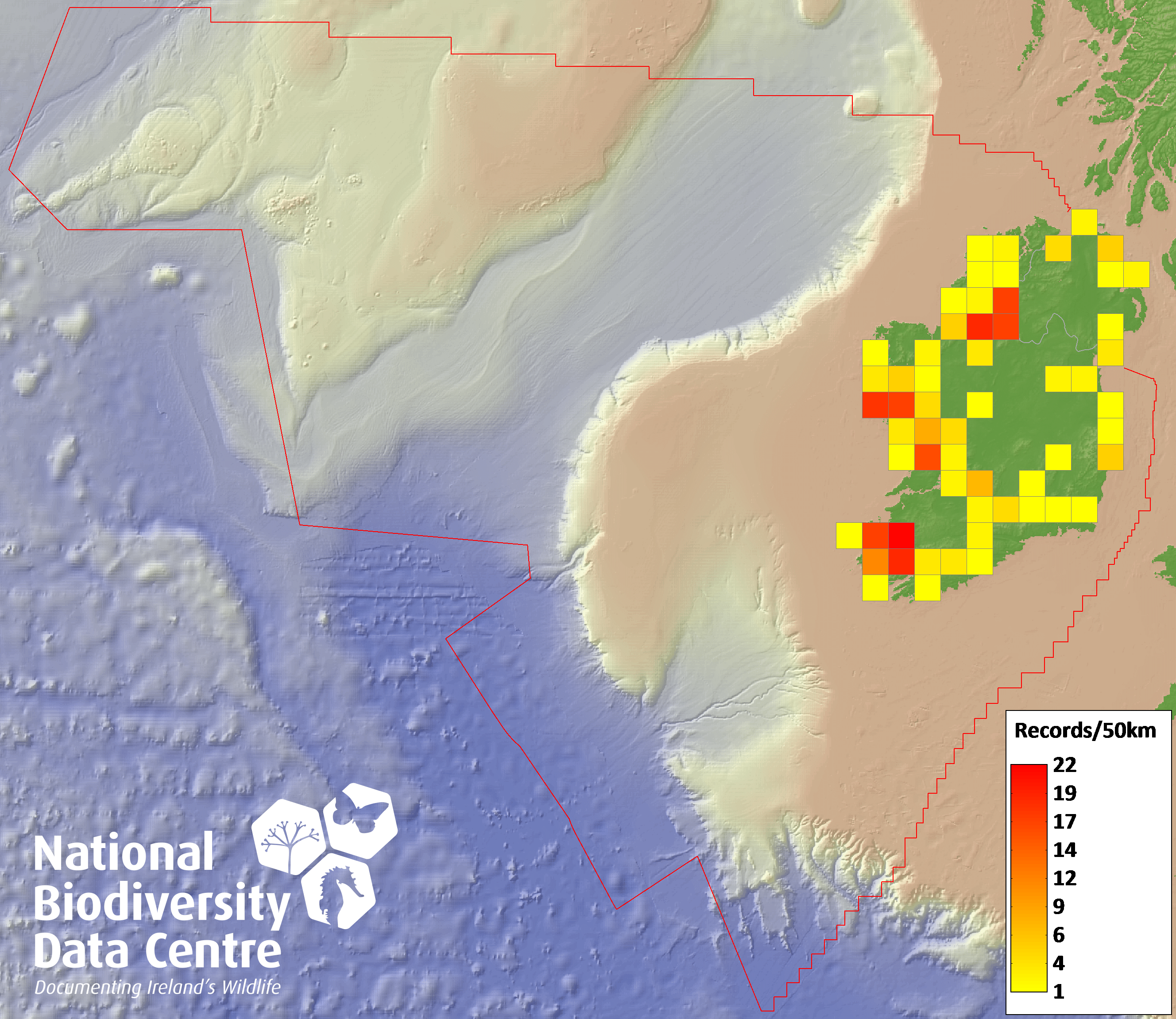 Distribution of the number of records recorded within each 10km grid square (ITM).Marine Map - 50km