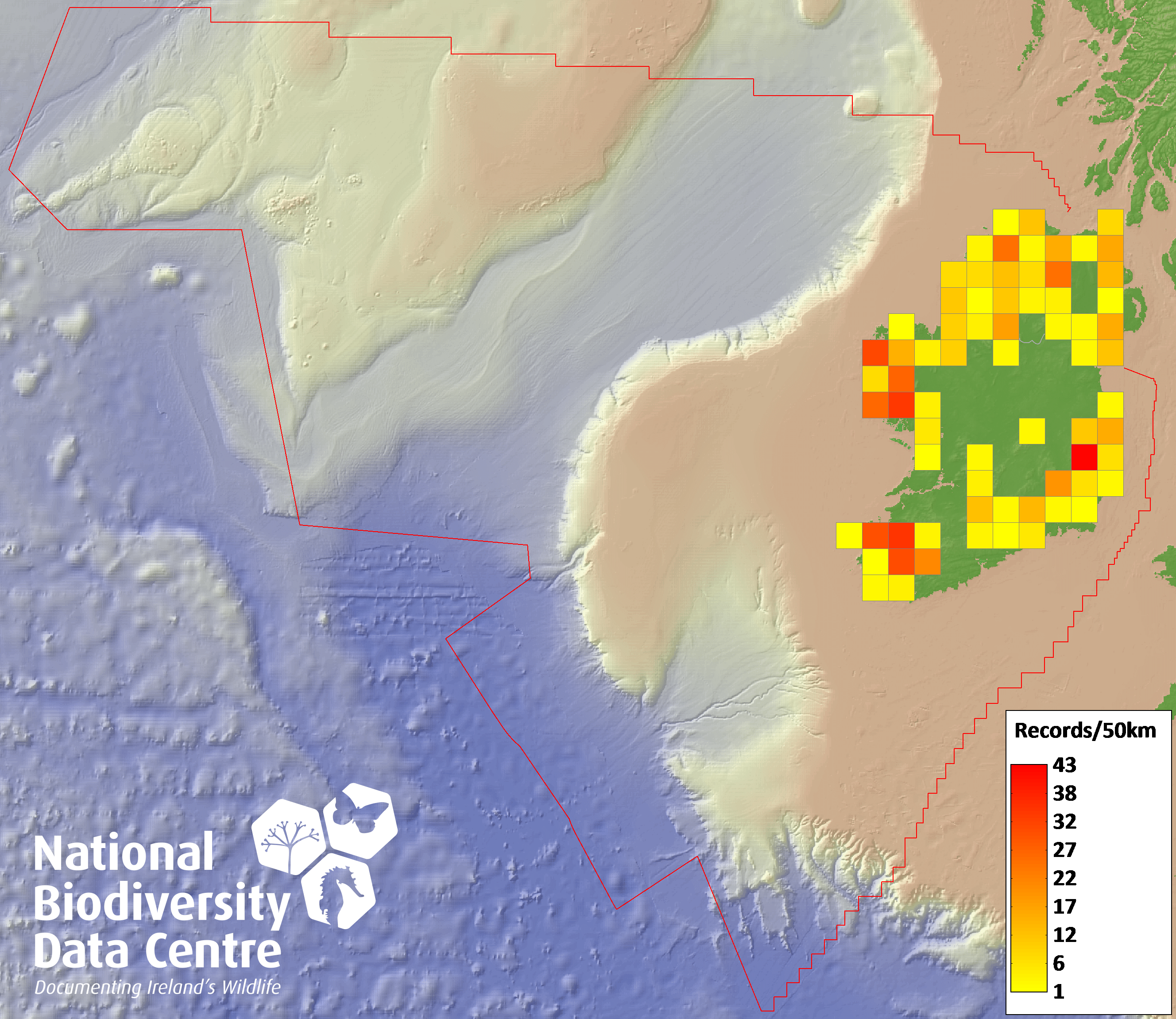 Distribution of the number of records recorded within each 10km grid square (ITM).Marine Map - 50km
