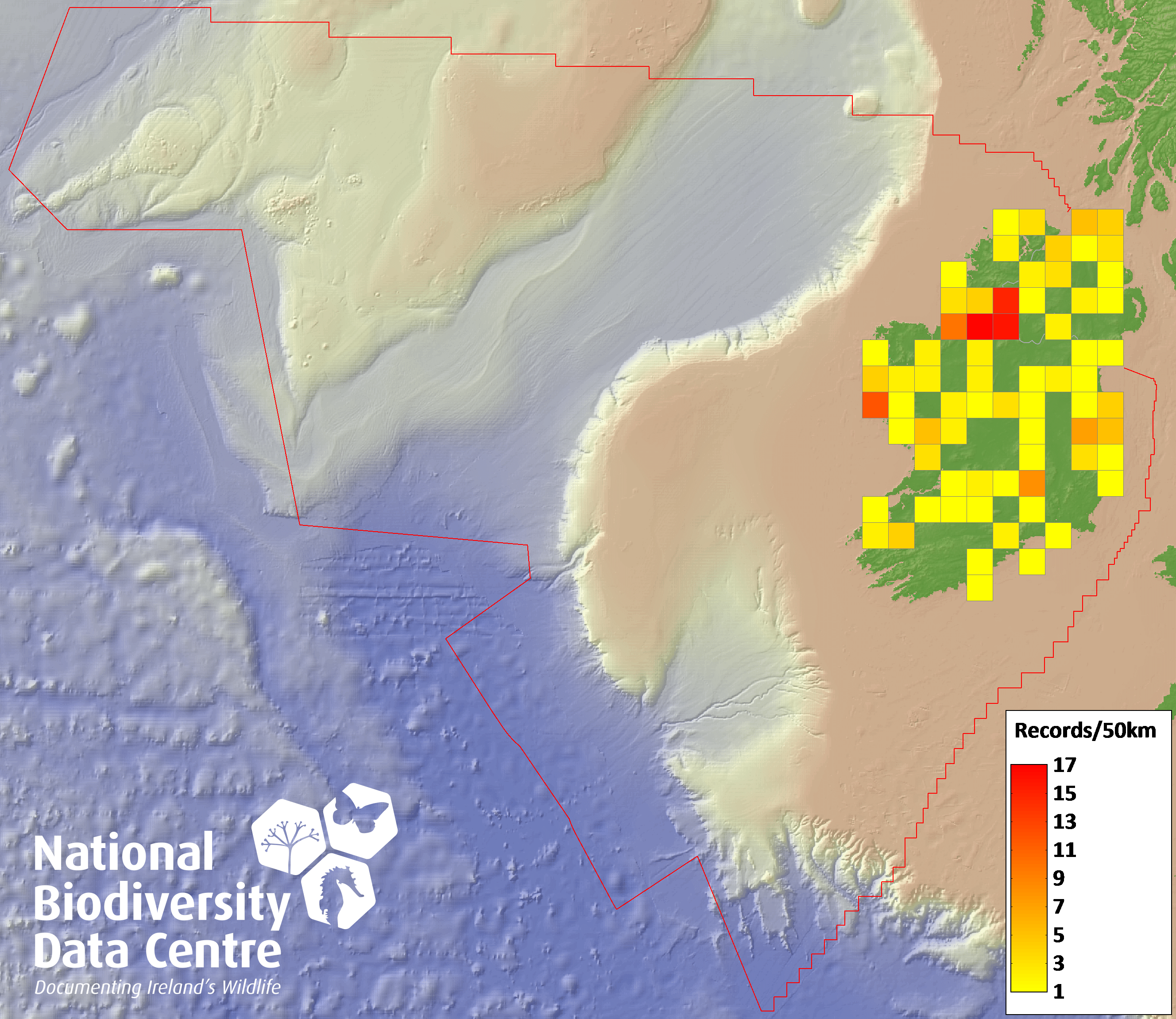 Distribution of the number of records recorded within each 10km grid square (ITM).Marine Map - 50km