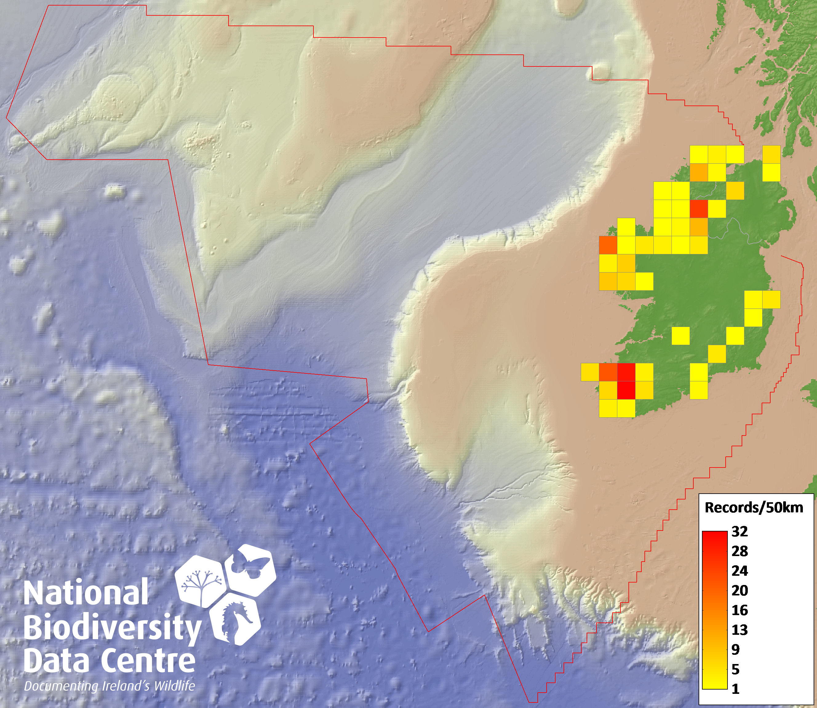 Distribution of the number of records recorded within each 10km grid square (ITM).Marine Map - 50km