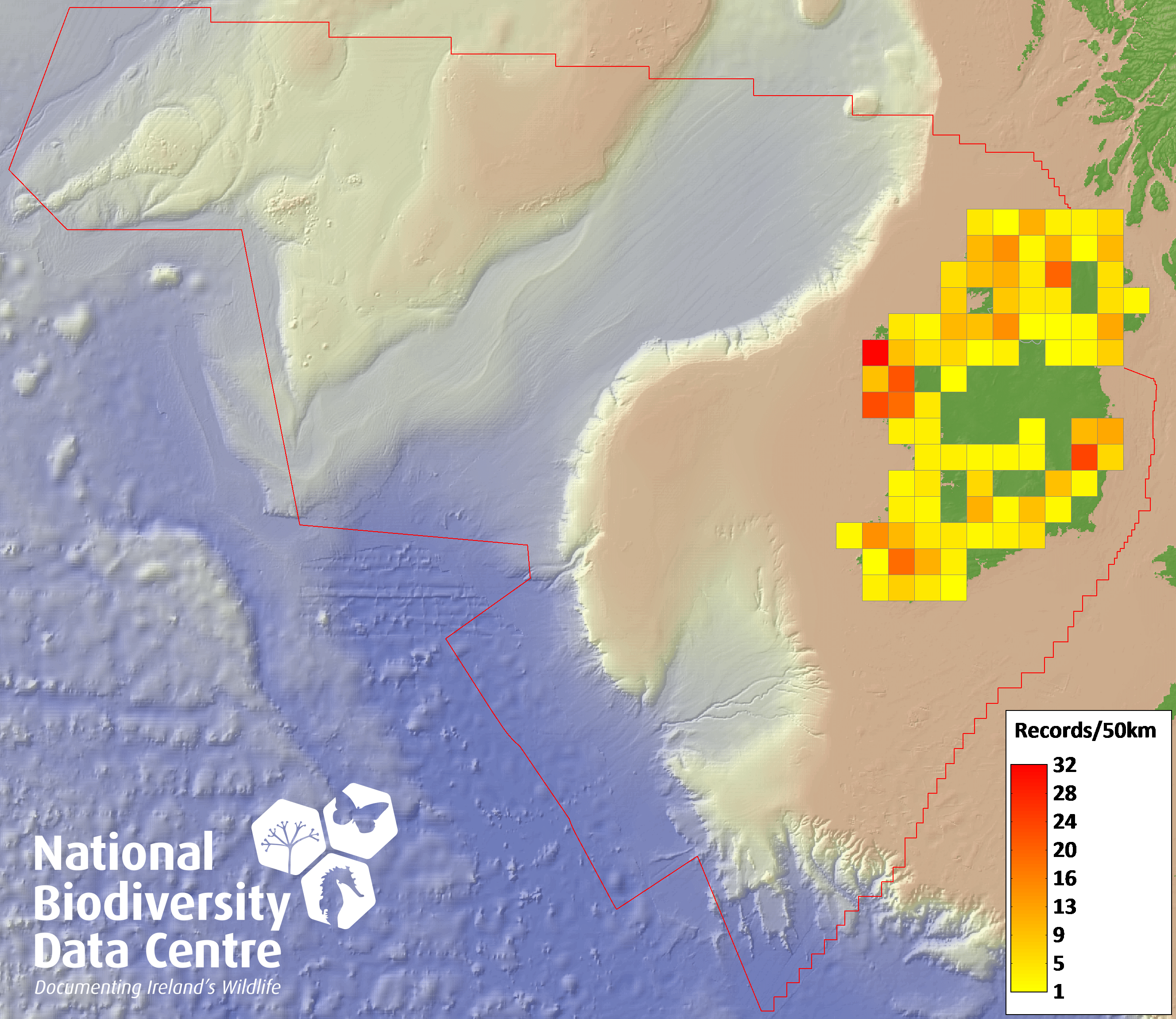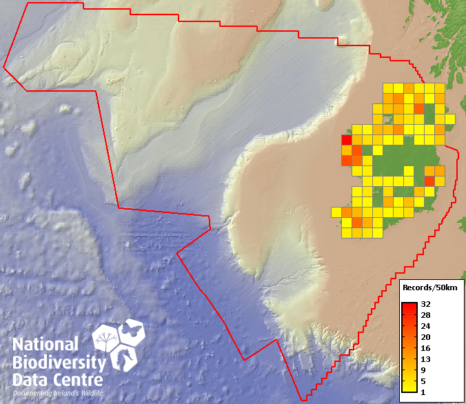 Distribution of the number of records recorded within each 10km grid square (ITM).Marine Map - 50km