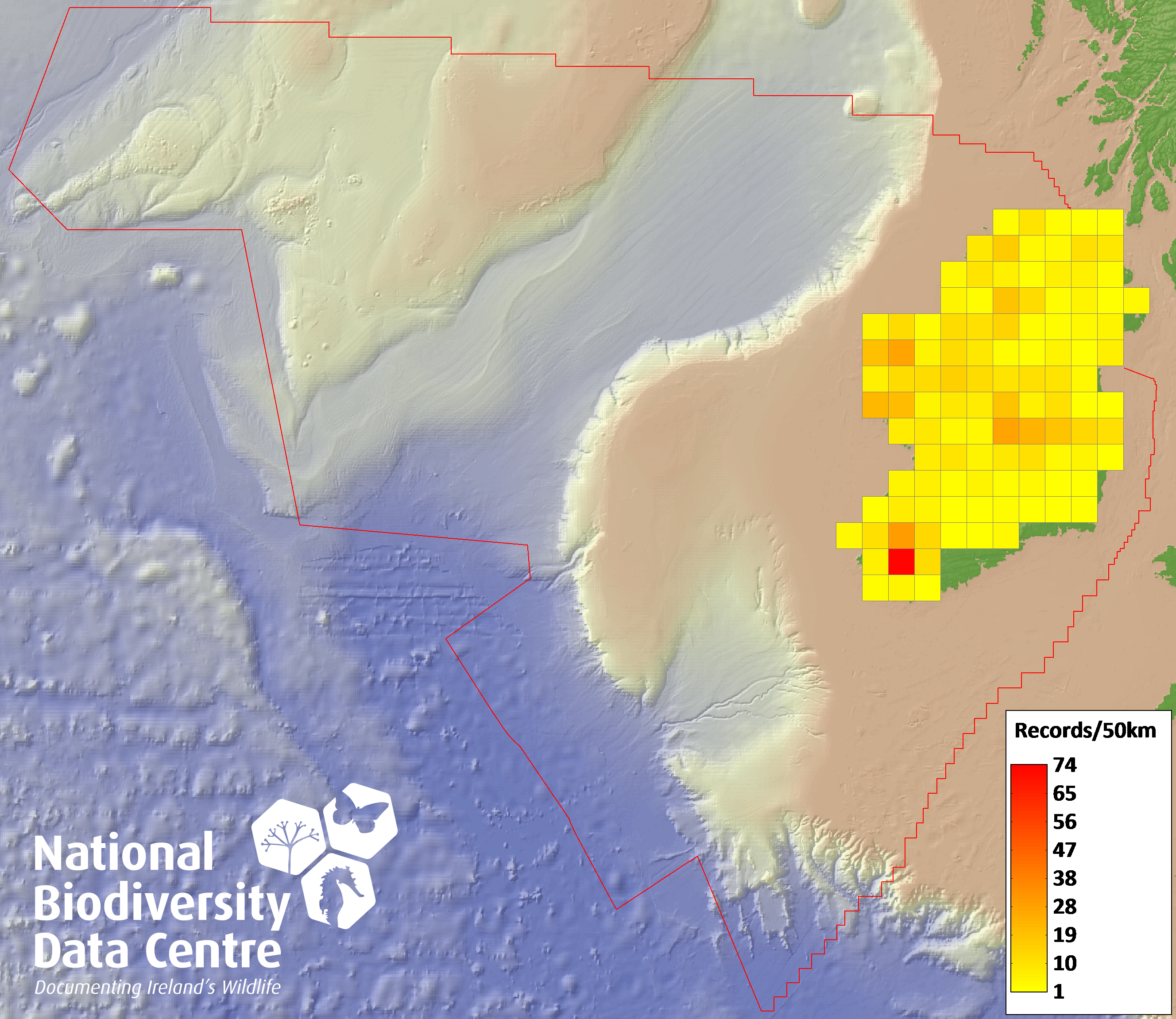Distribution of the number of records recorded within each 10km grid square (ITM).Marine Map - 50km