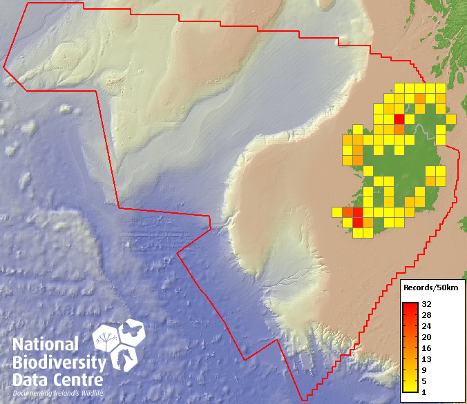 Distribution of the number of records recorded within each 10km grid square (ITM).Marine Map - 50km