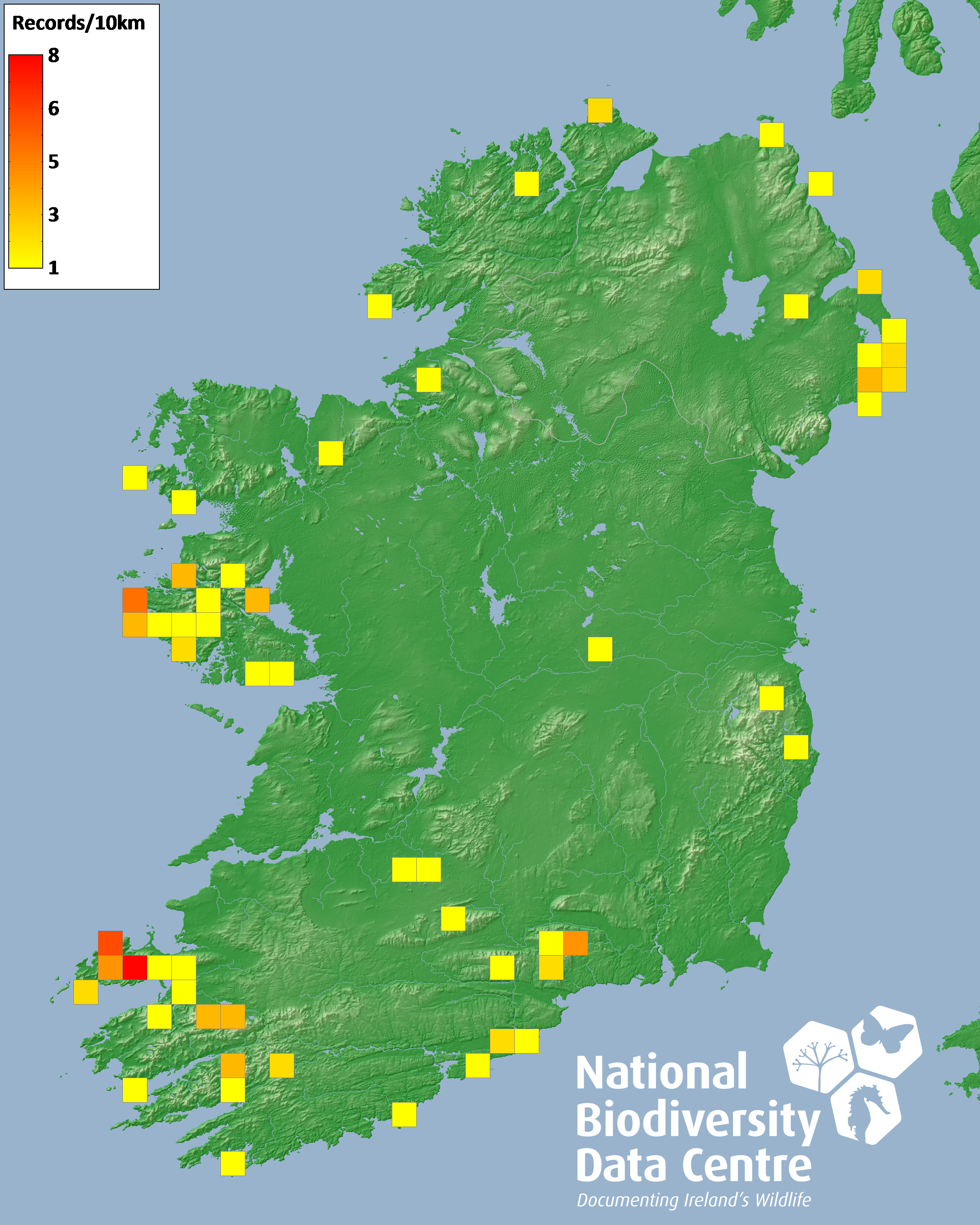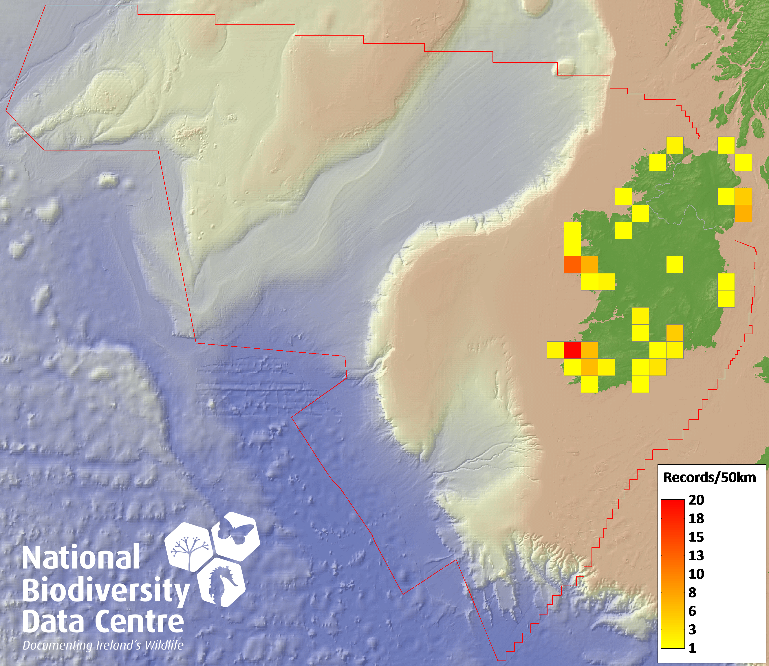 Distribution of the number of records recorded within each 10km grid square (ITM).Marine Map - 50km