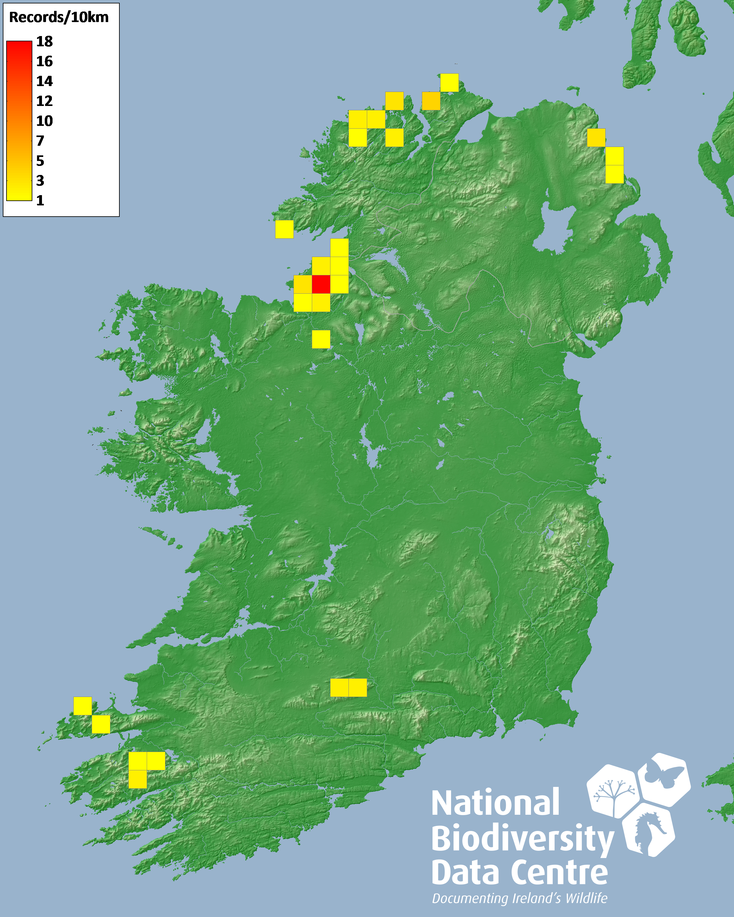 Distribution of the number of records recorded within each 10km grid square (ITM).Marine Map - 50km