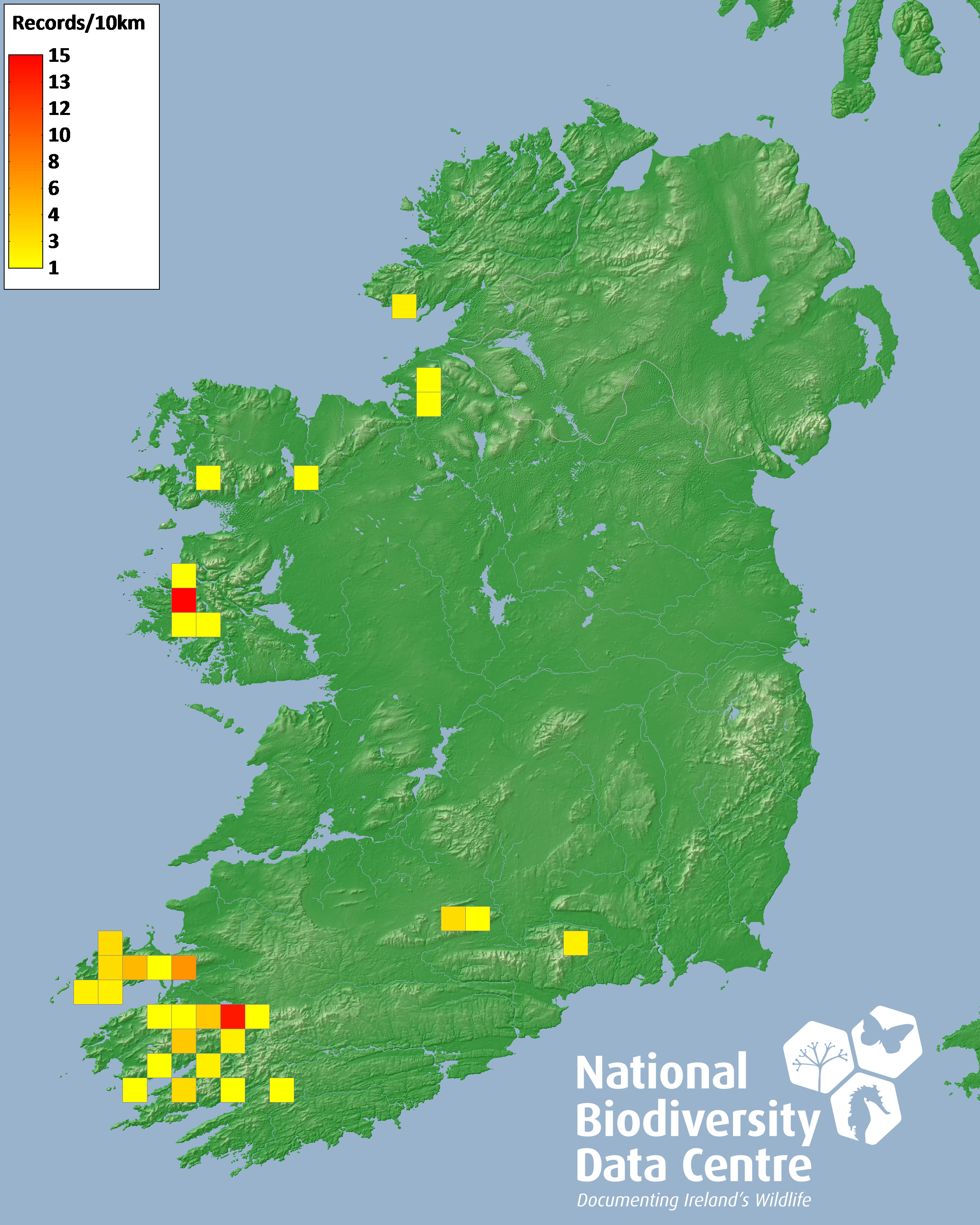 Distribution of the number of records recorded within each 10km grid square (ITM).Marine Map - 50km