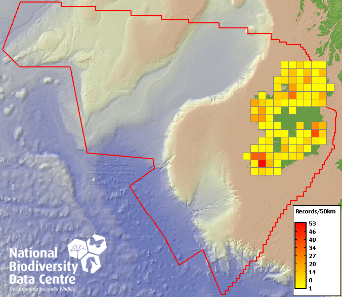 Distribution of the number of records recorded within each 10km grid square (ITM).Marine Map - 50km