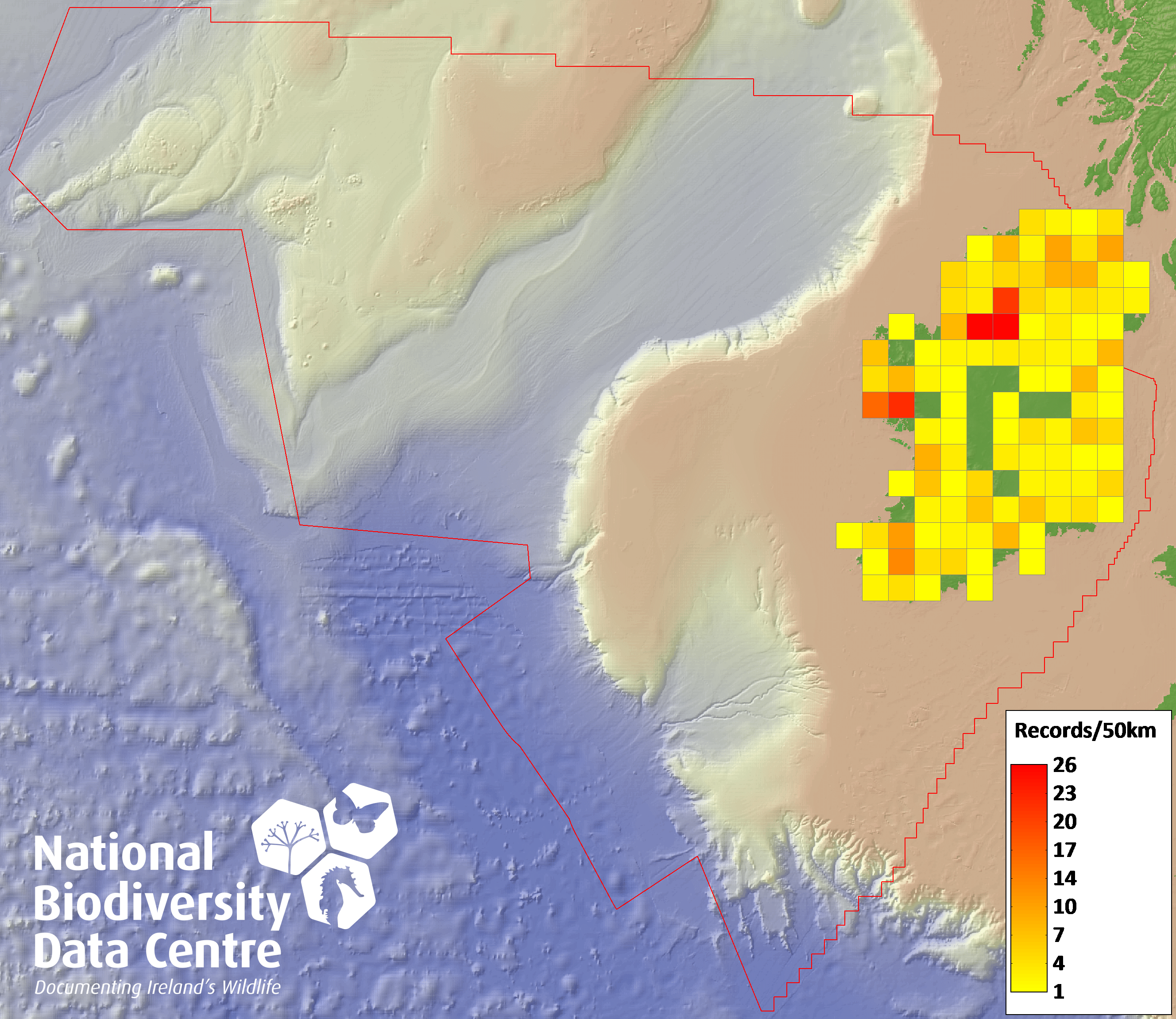 Distribution of the number of records recorded within each 10km grid square (ITM).Marine Map - 50km