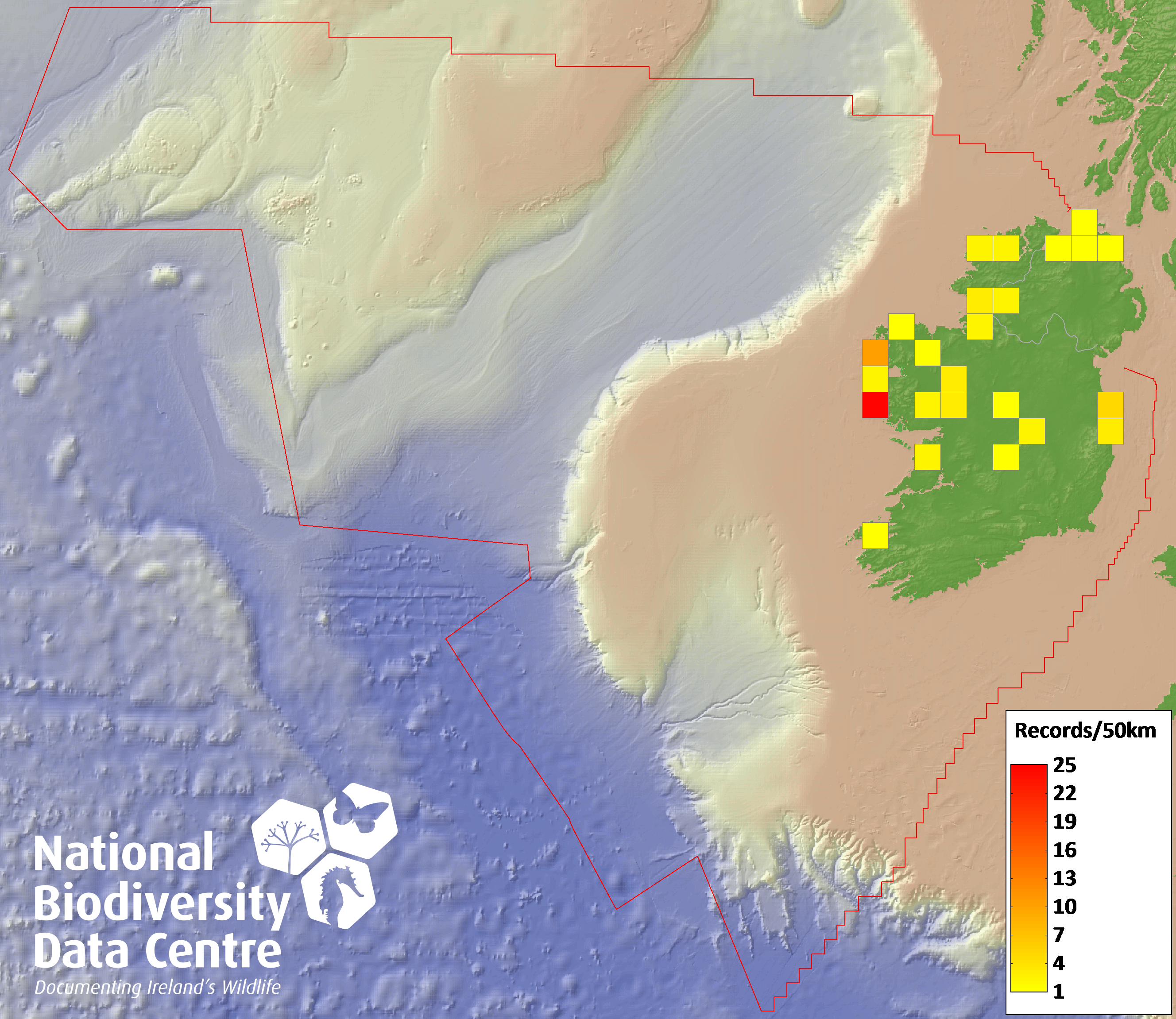Distribution of the number of records recorded within each 10km grid square (ITM).Marine Map - 50km