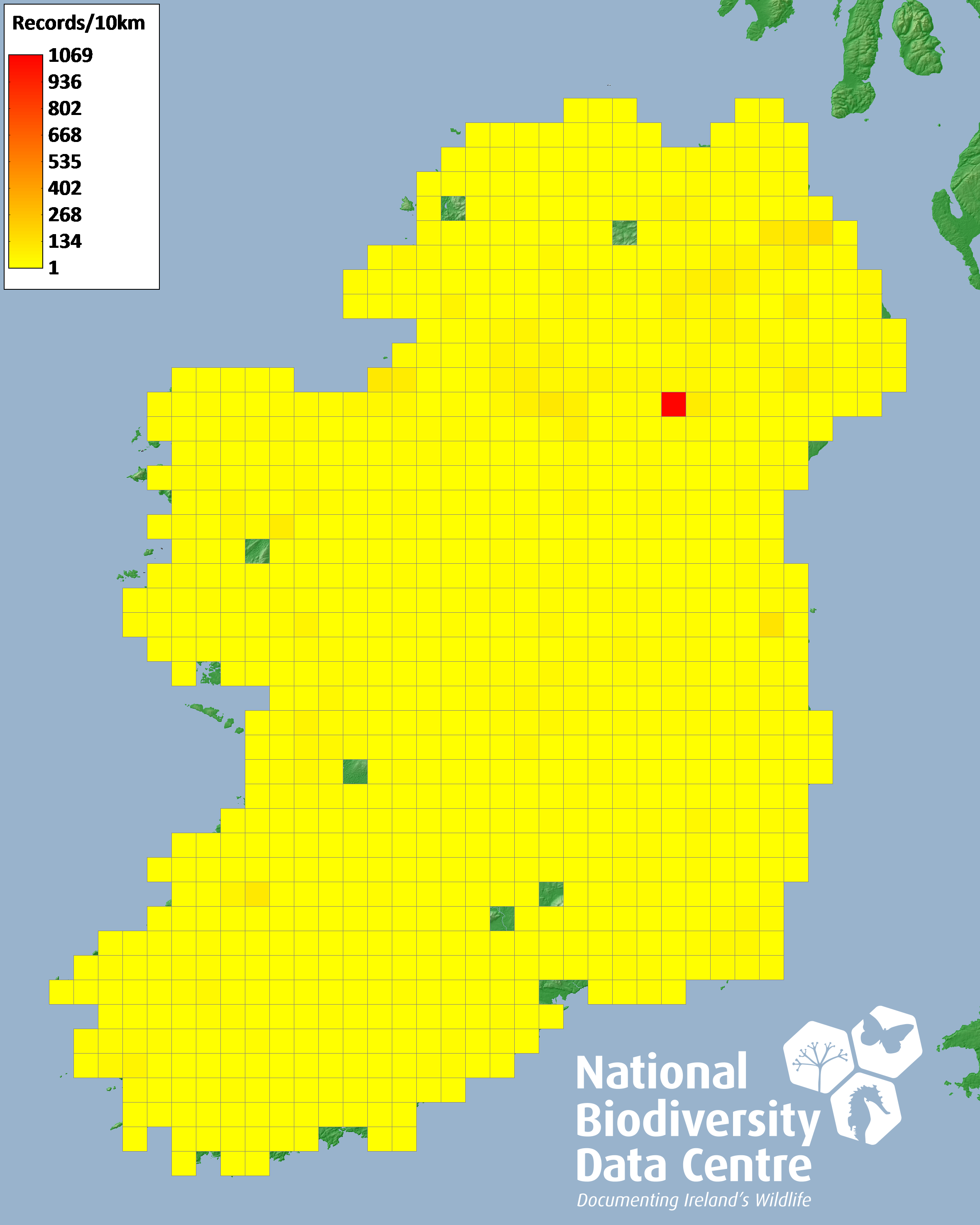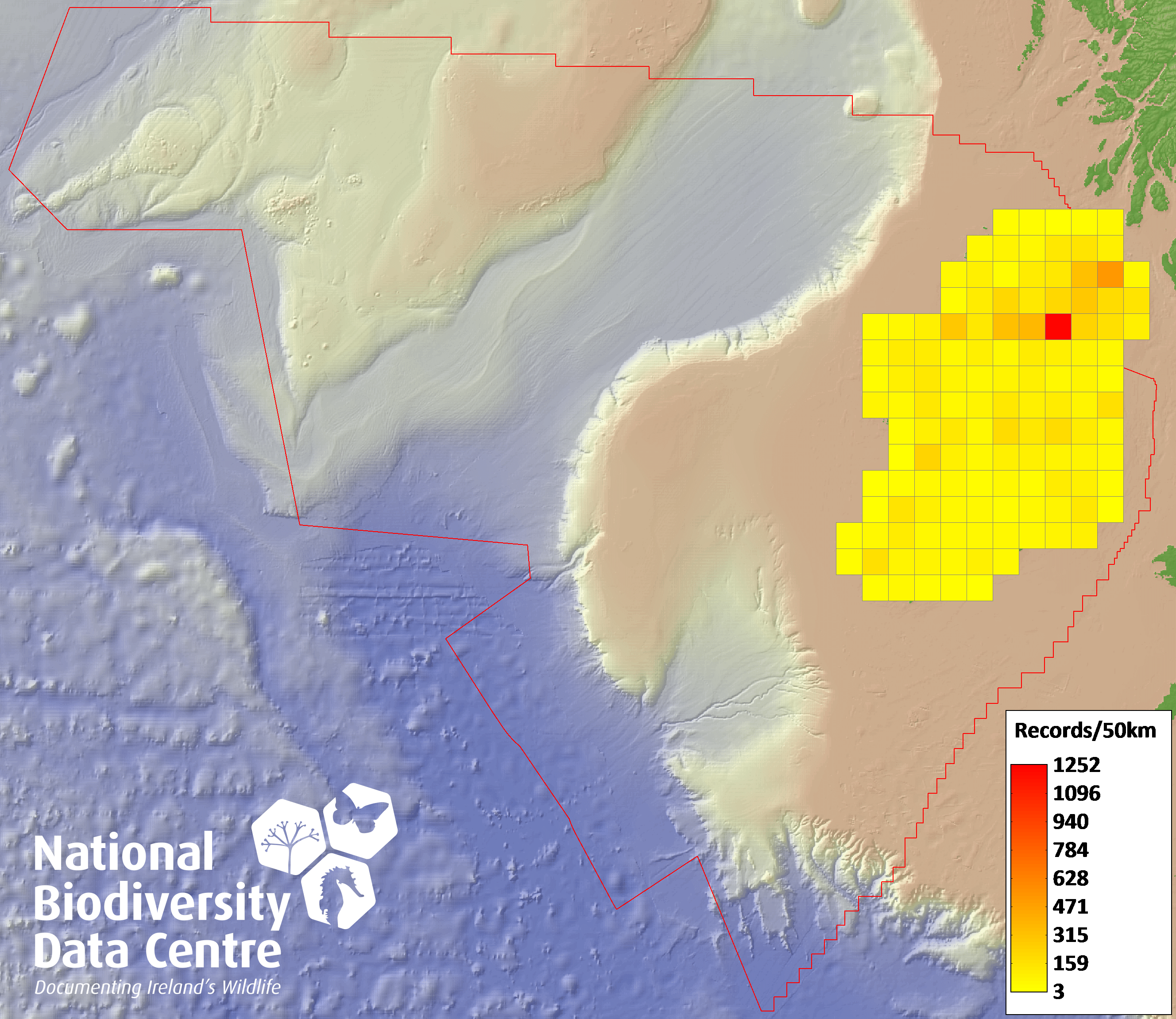 Distribution of the number of records recorded within each 10km grid square (ITM).Marine Map - 50km