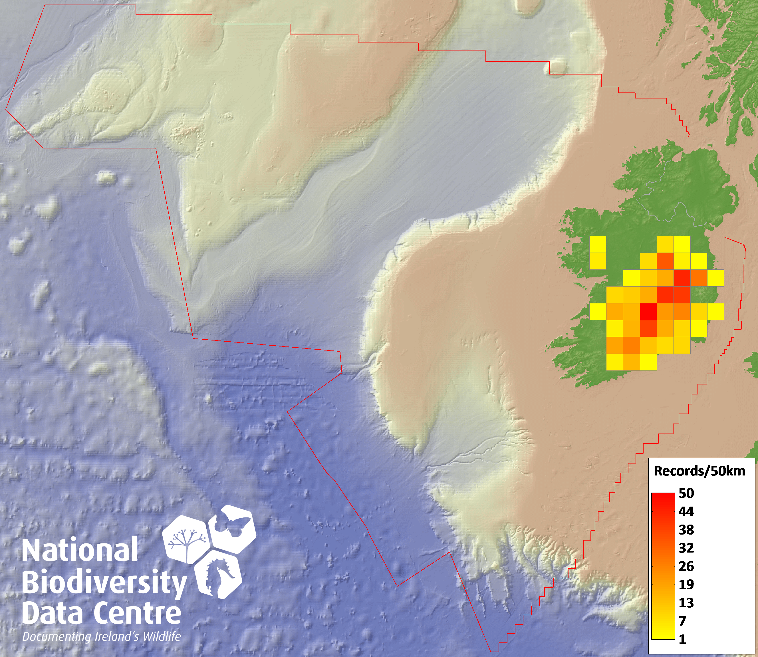 Distribution of the number of records recorded within each 10km grid square (ITM).Marine Map - 50km