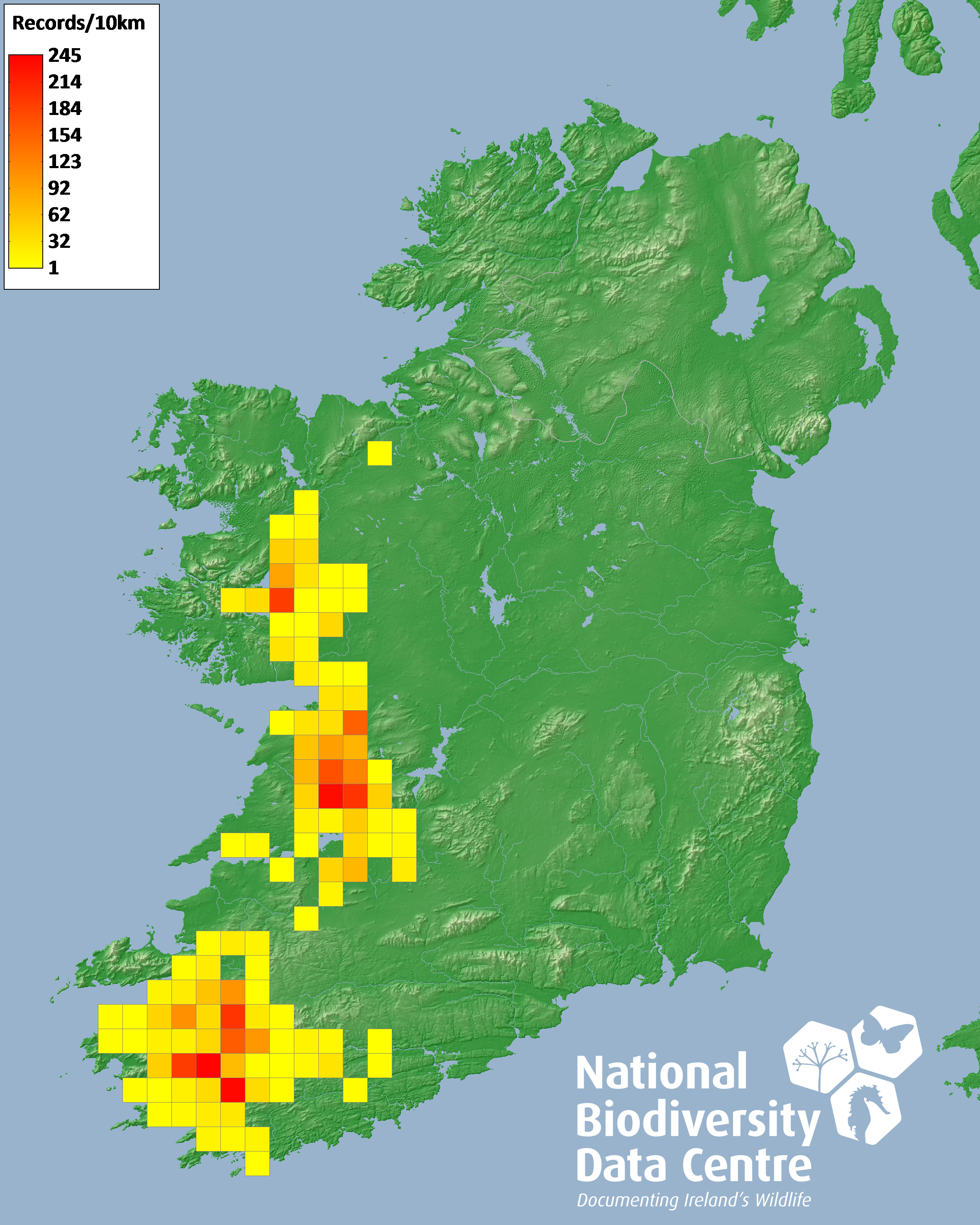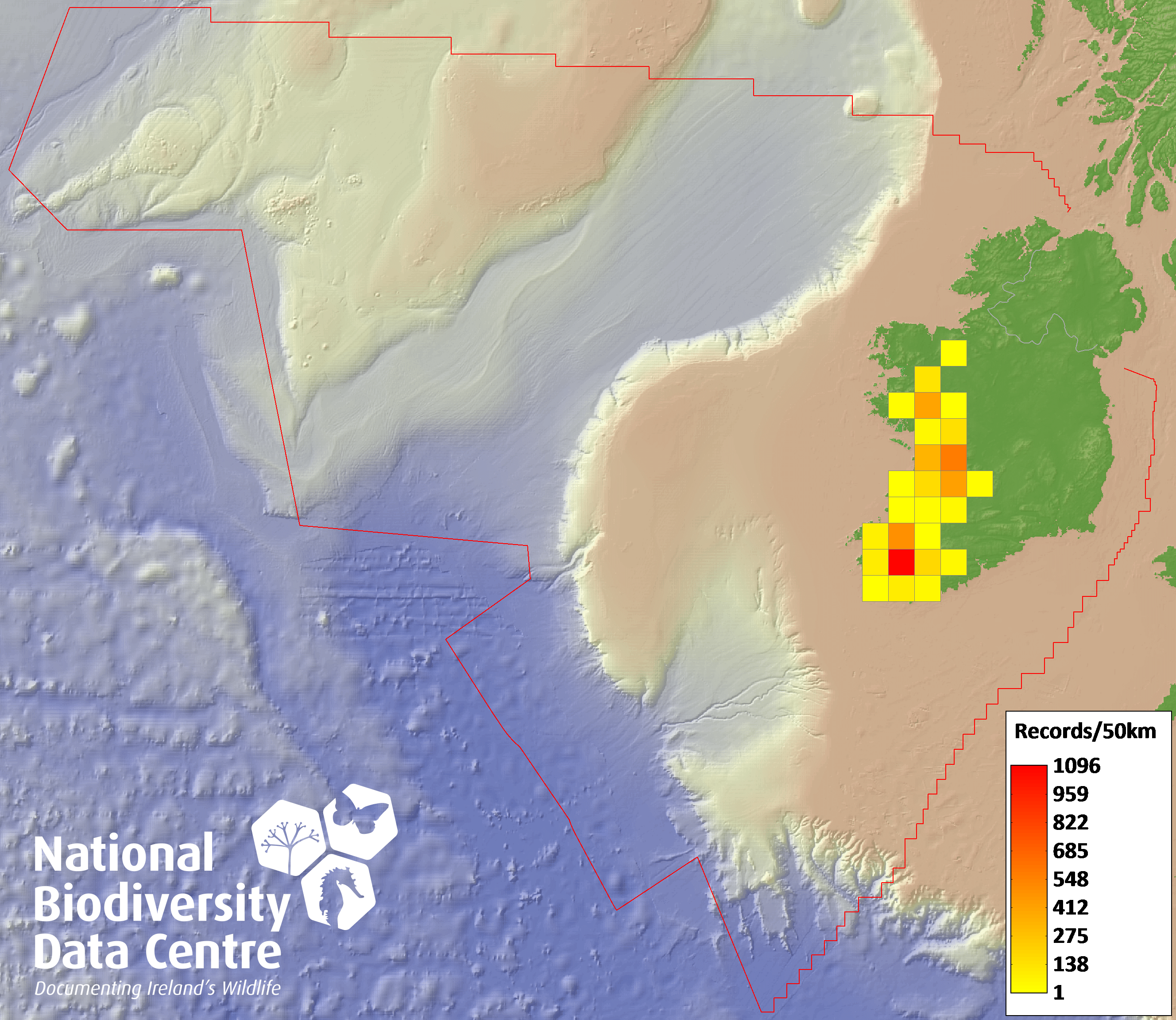 Distribution of the number of records recorded within each 10km grid square (ITM).Marine Map - 50km