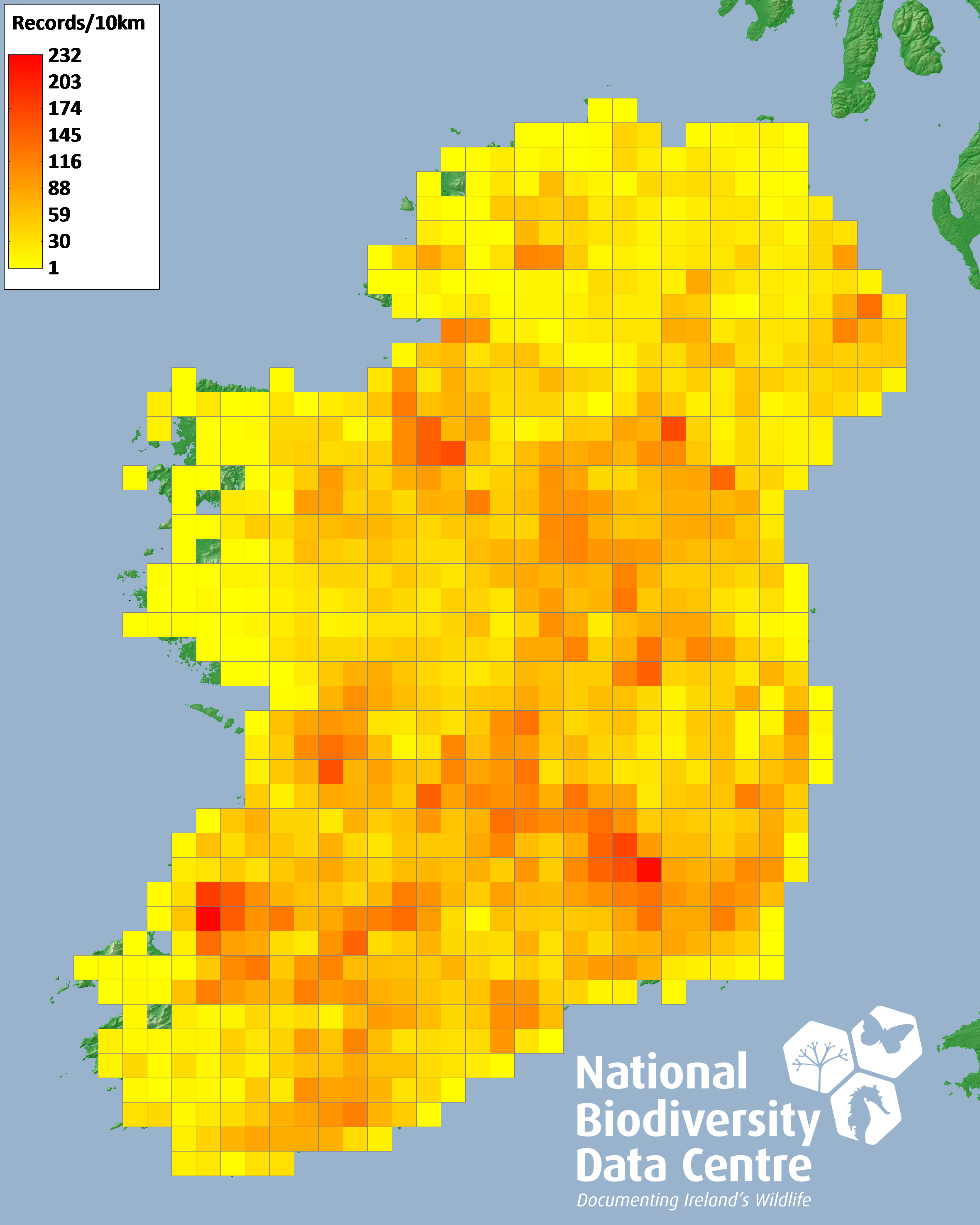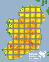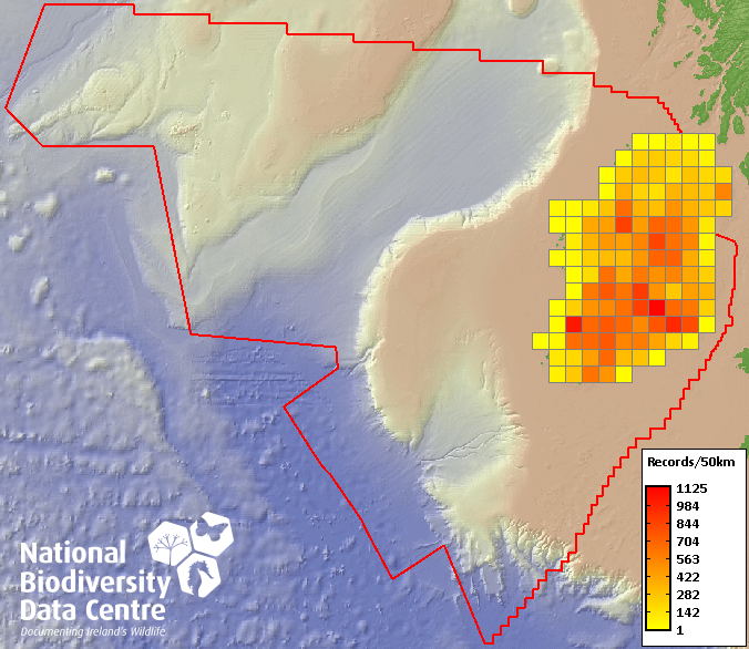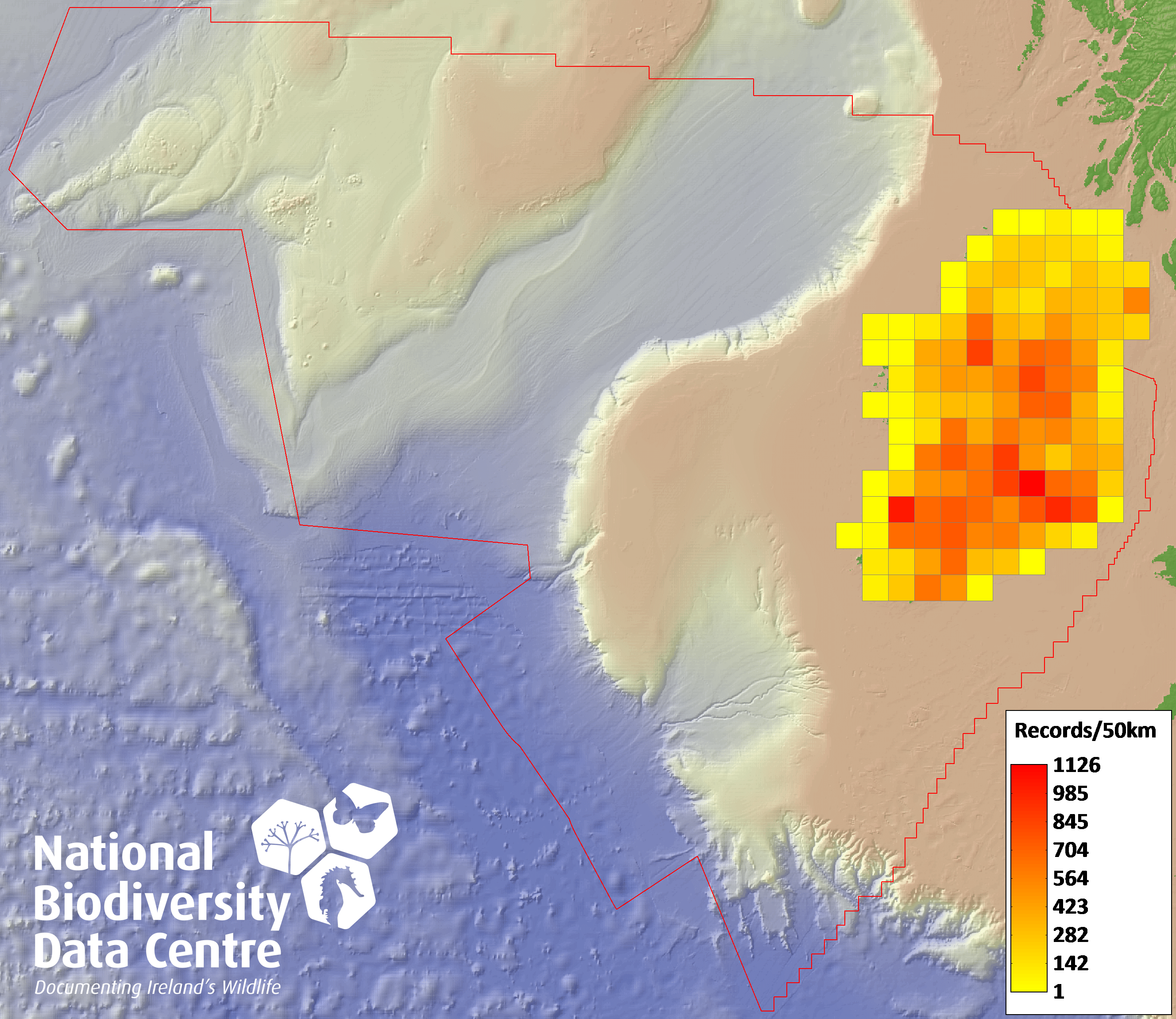 Distribution of the number of records recorded within each 10km grid square (ITM).Marine Map - 50km