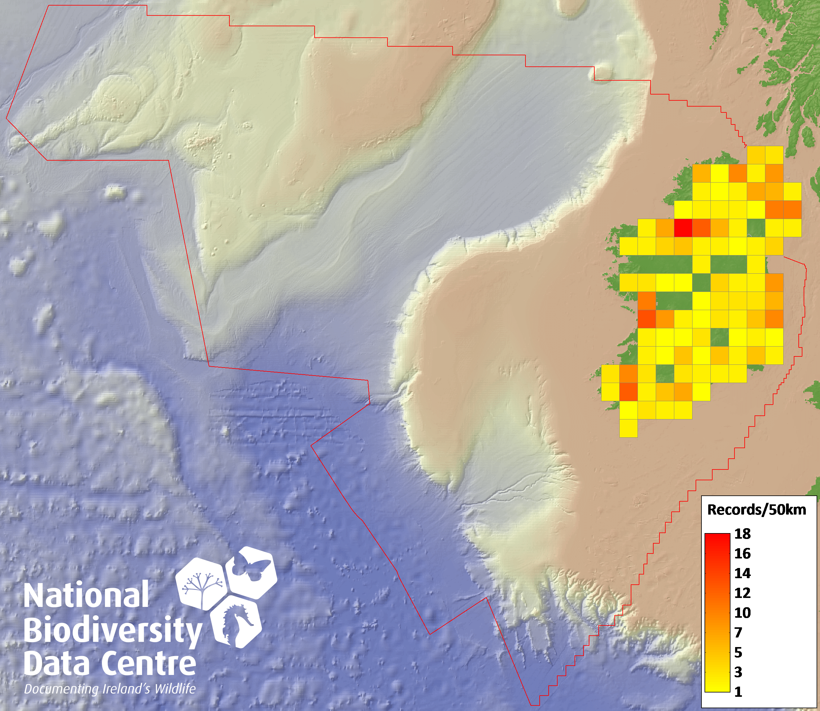 Distribution of the number of records recorded within each 10km grid square (ITM).Marine Map - 50km