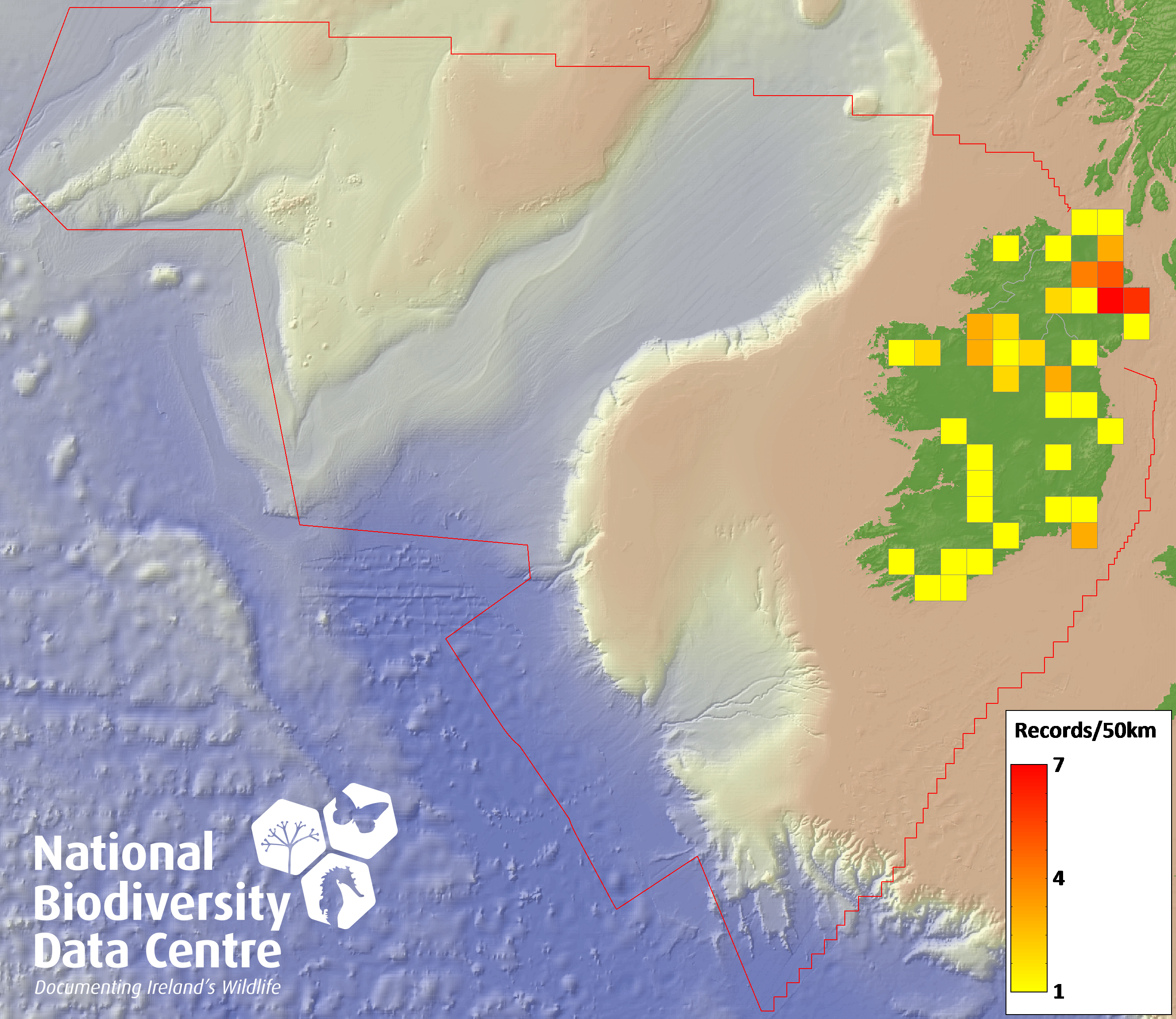 Distribution of the number of records recorded within each 10km grid square (ITM).Marine Map - 50km