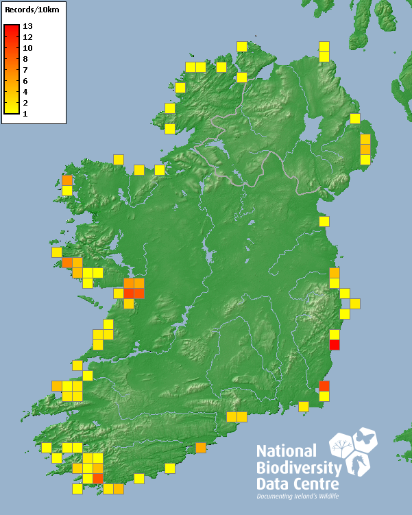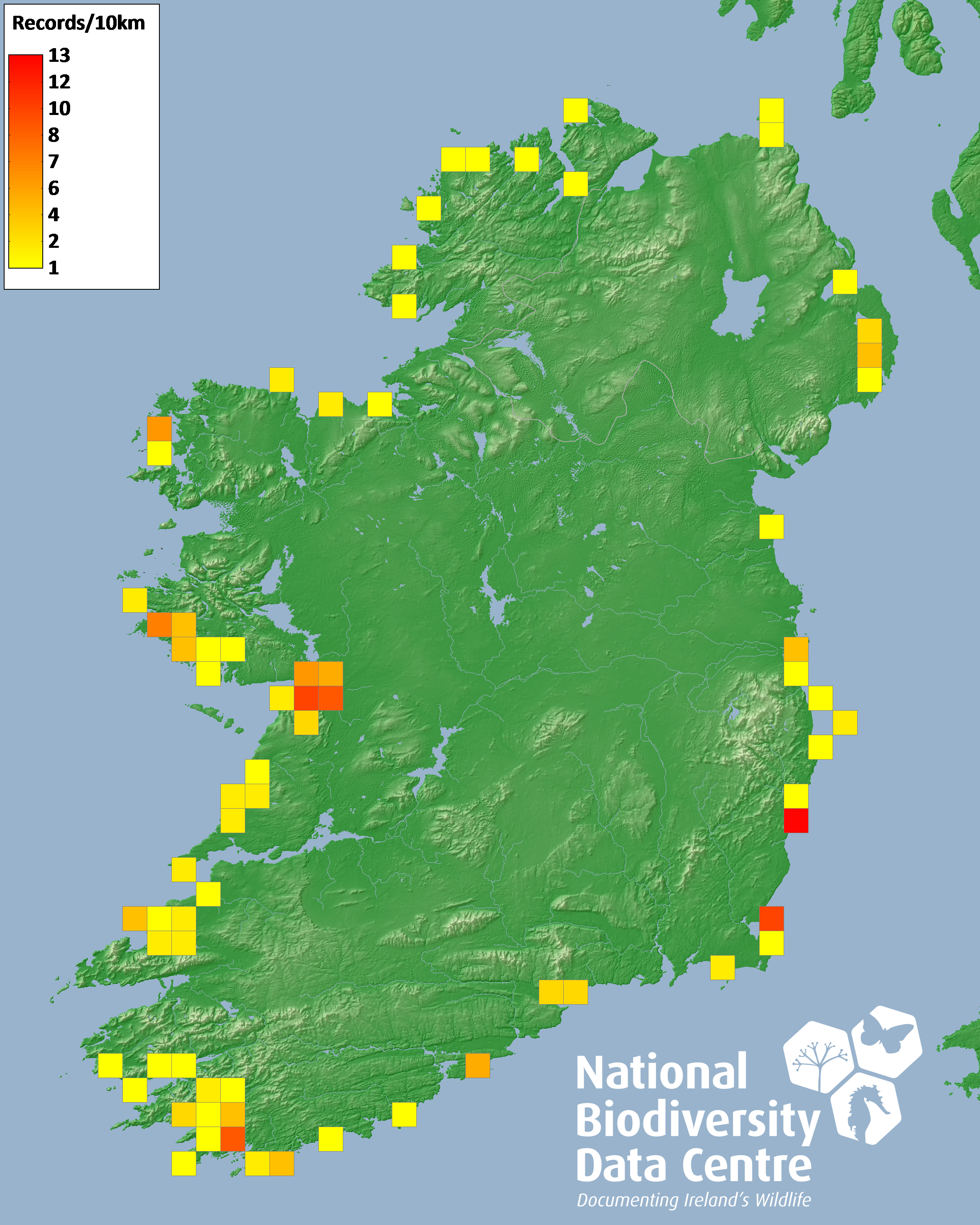 Distribution of the number of records recorded within each 10km grid square (ITM).Marine Map - 50km