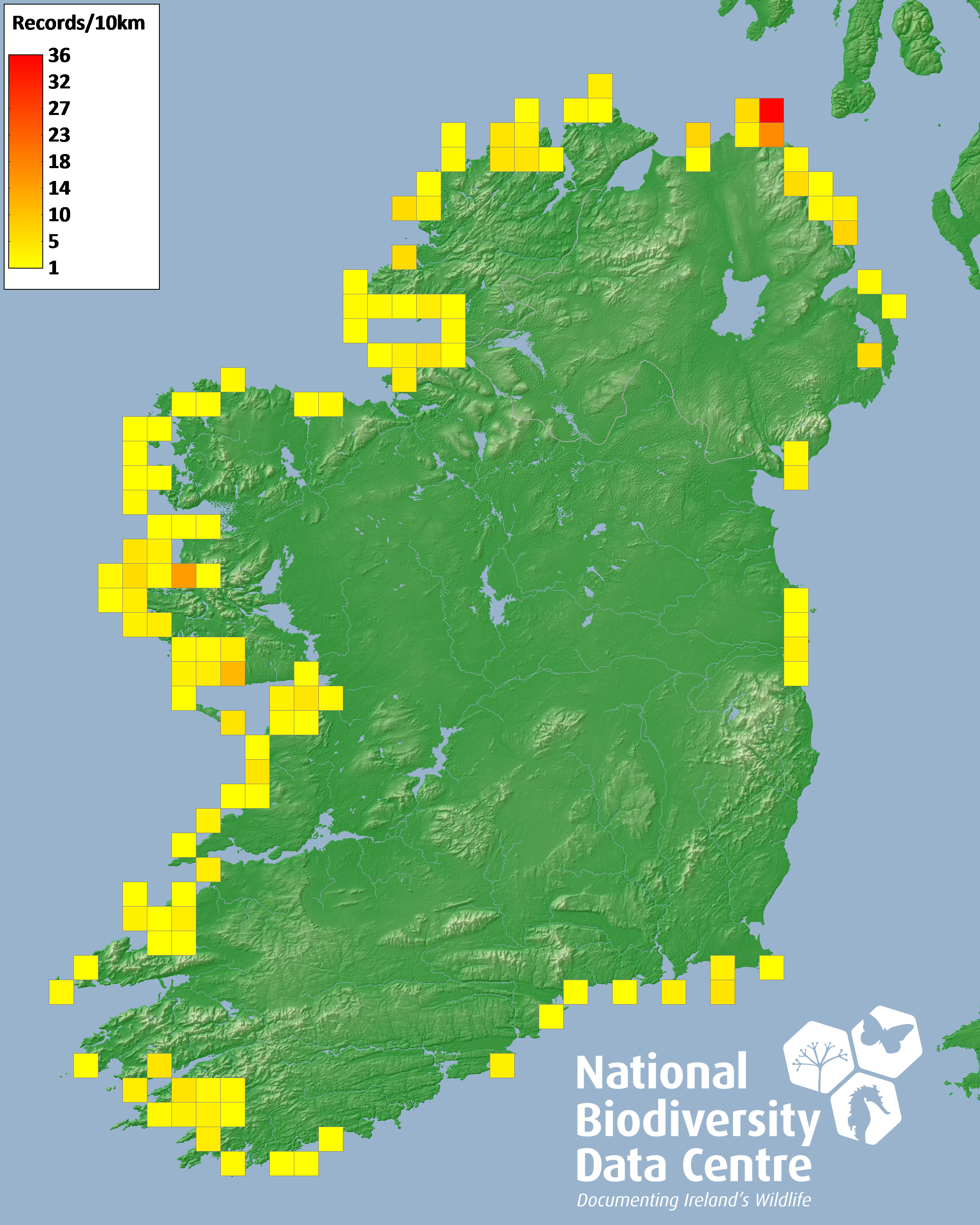 Distribution of the number of records recorded within each 10km grid square (ITM).Marine Map - 50km