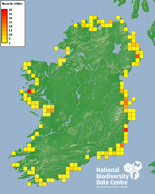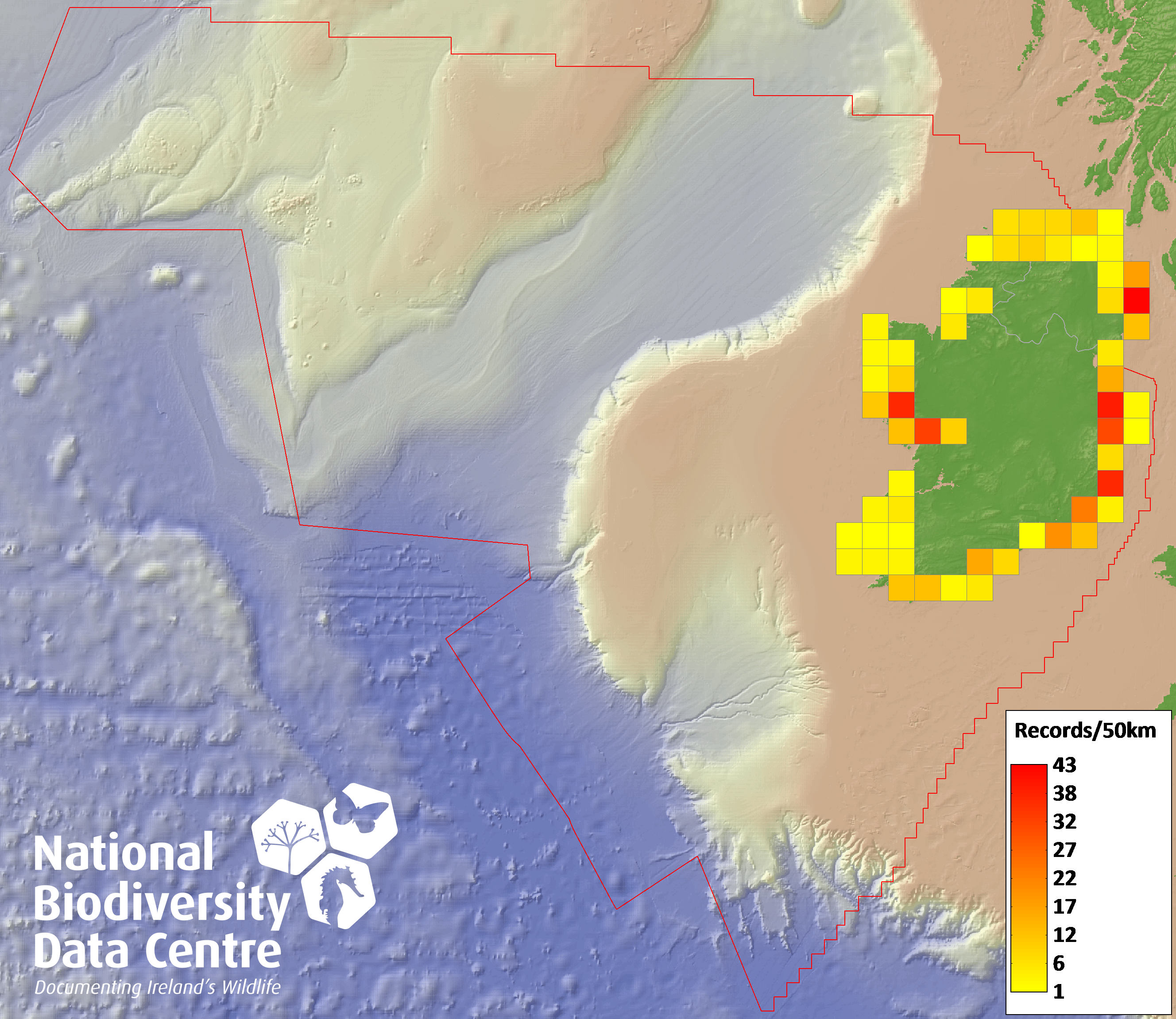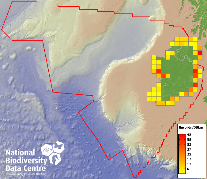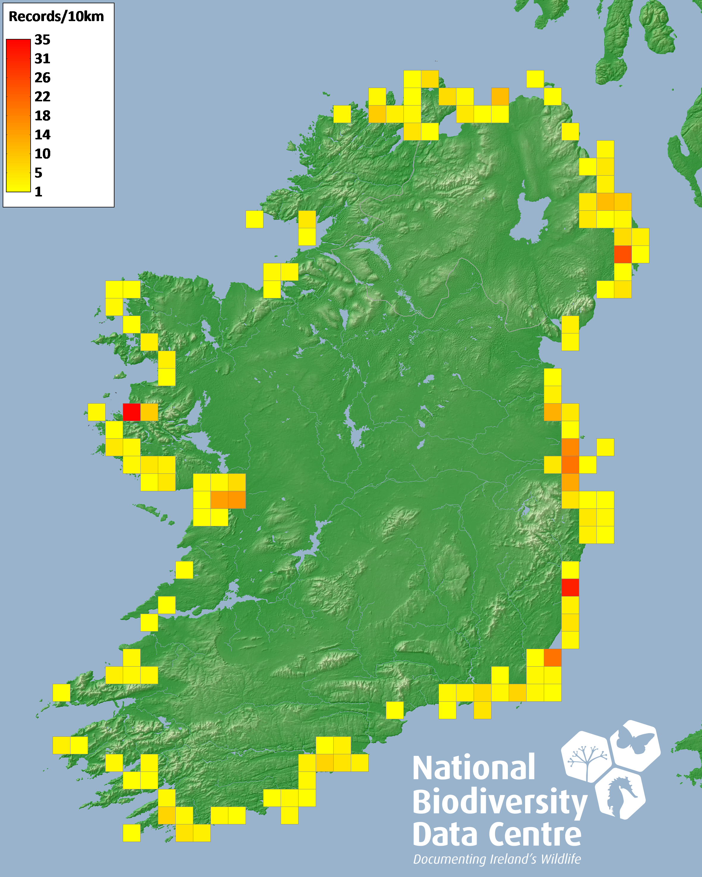 Distribution of the number of records recorded within each 10km grid square (ITM).Marine Map - 50km
