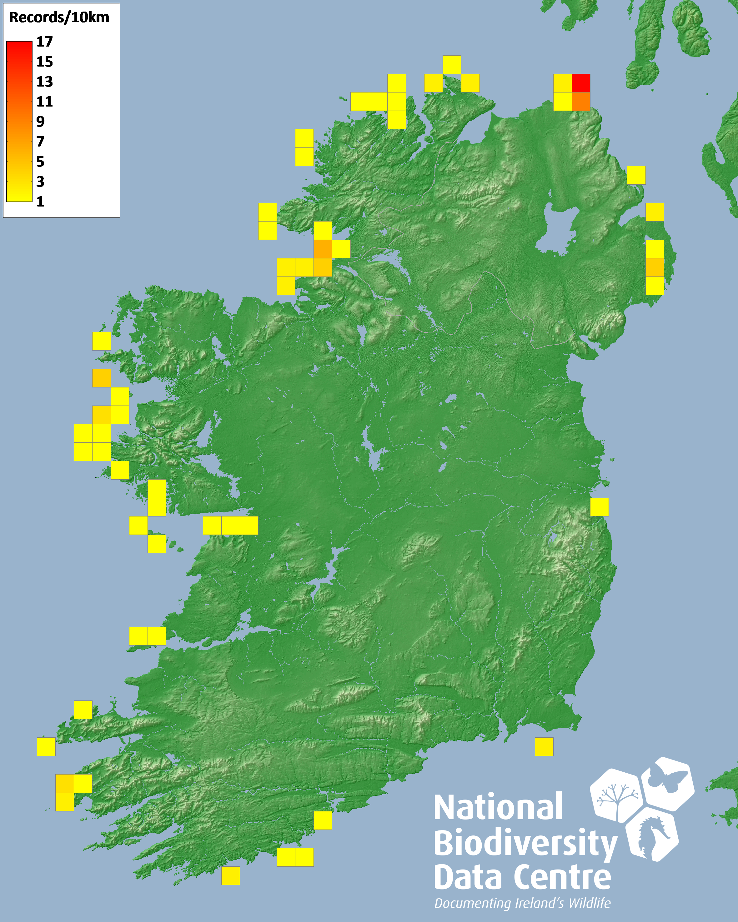 Distribution of the number of records recorded within each 10km grid square (ITM).Marine Map - 50km