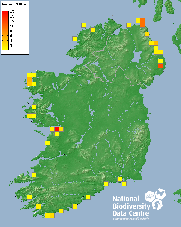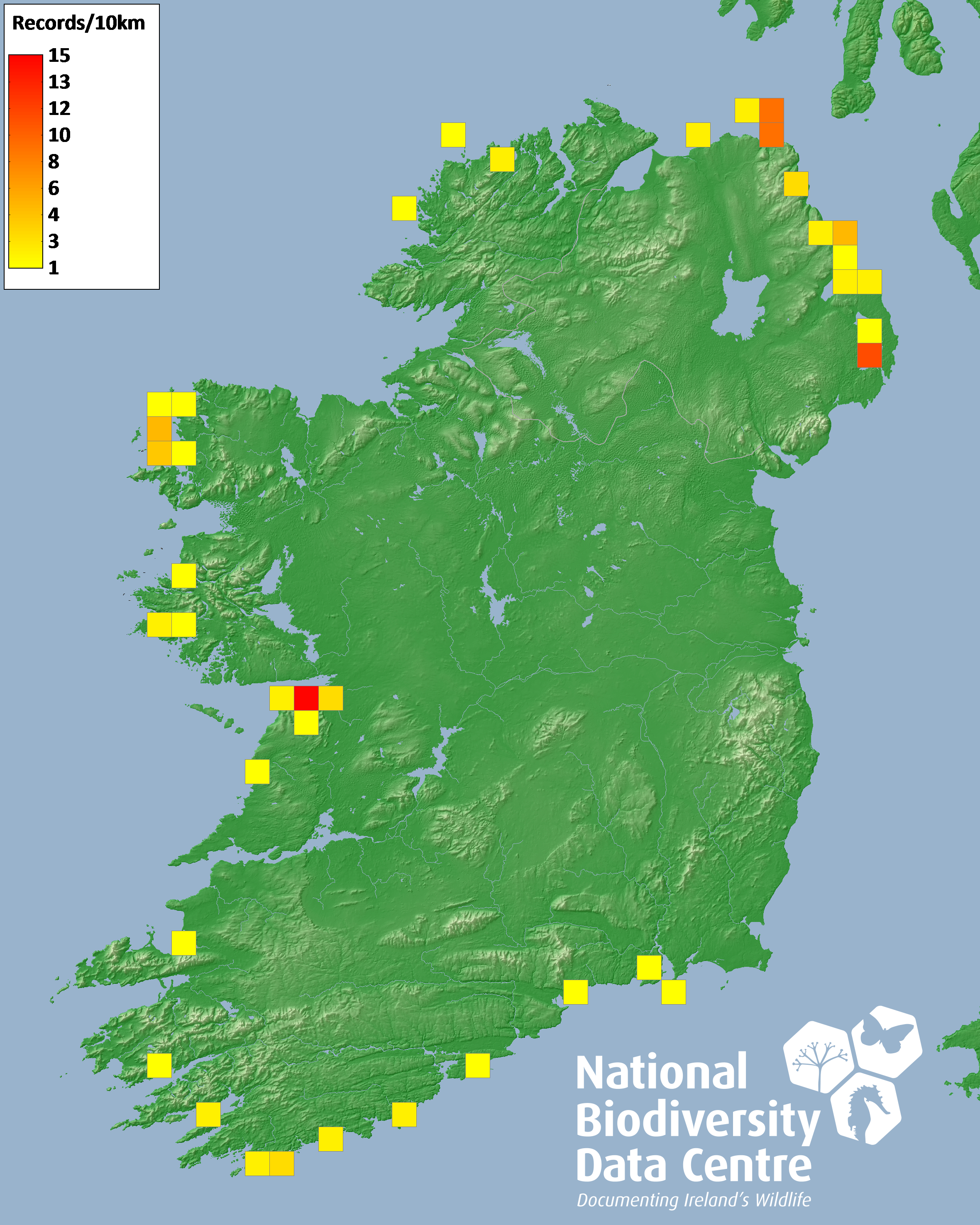 Distribution of the number of records recorded within each 10km grid square (ITM).Marine Map - 50km